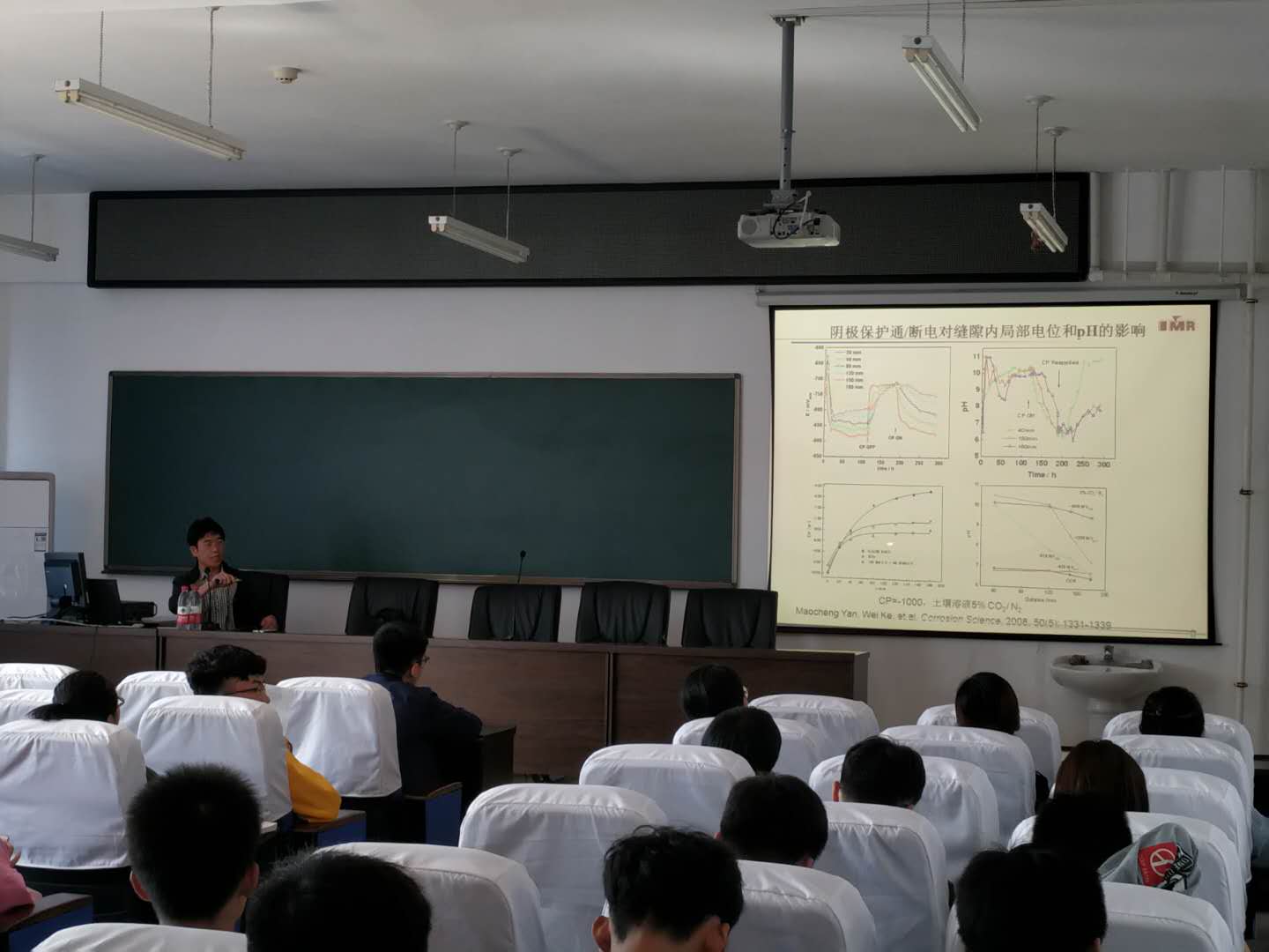 闫茂成副研究员围绕杂散电流干扰下埋地管线的腐蚀机理及评价方法进行了阐释。会后,闫茂成副研究员与刘洪胜院长及部分教师进行了深层次的学术讨论。此次学术报告促进了我院科研团队在“腐蚀与防护”方面与学术前沿的交流。