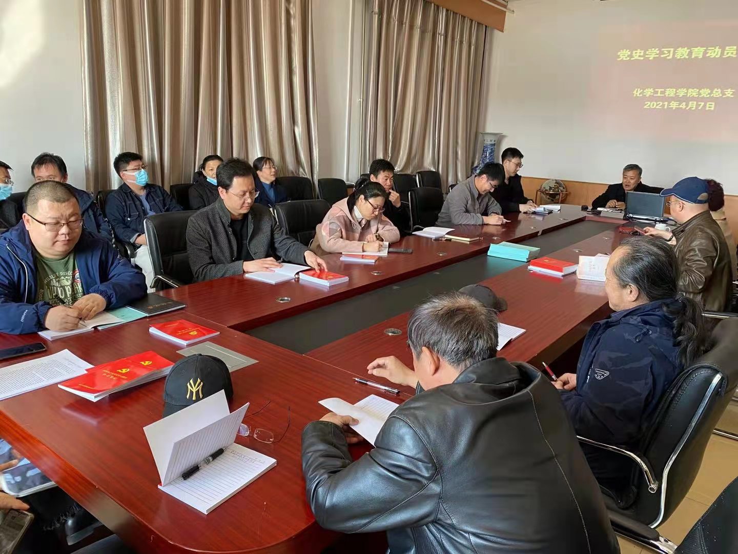 4月7日下午2点,化学工程学院党总支在化学楼224会议室召开了学院党史学习教育动员大会,学院全体教工党员参加了会议。会上,学院党总支委员赵秀丽同志领学了习近平总书记在党史学习教育动员大会上的重要讲话,党总支副书记徐宏书同志传达了学校党史学习教育动员大会精神,学院党总支书记刘洪胜同志对学院开展党史学习教育进行了动员部署,提出了学习要求:一是全体党员要深刻认识到党史学习的重要意义。准确把握“十六字”具体目标,即“学史明理、学史增信、学史崇德、学史力行”。 深刻认识开展党史学习教育是党中央作出的重大决策部署,是落实立德树人根本任务的迫切需要。二是要盯准学习目标,真学细学。要做到自学和集中学习相结合,专题培训和参观相结合;三要强化思想政治教育,坚守意识形态。深化学习教育,深入开展“我为群众办实事”,为学校转型发展做出更大贡献。