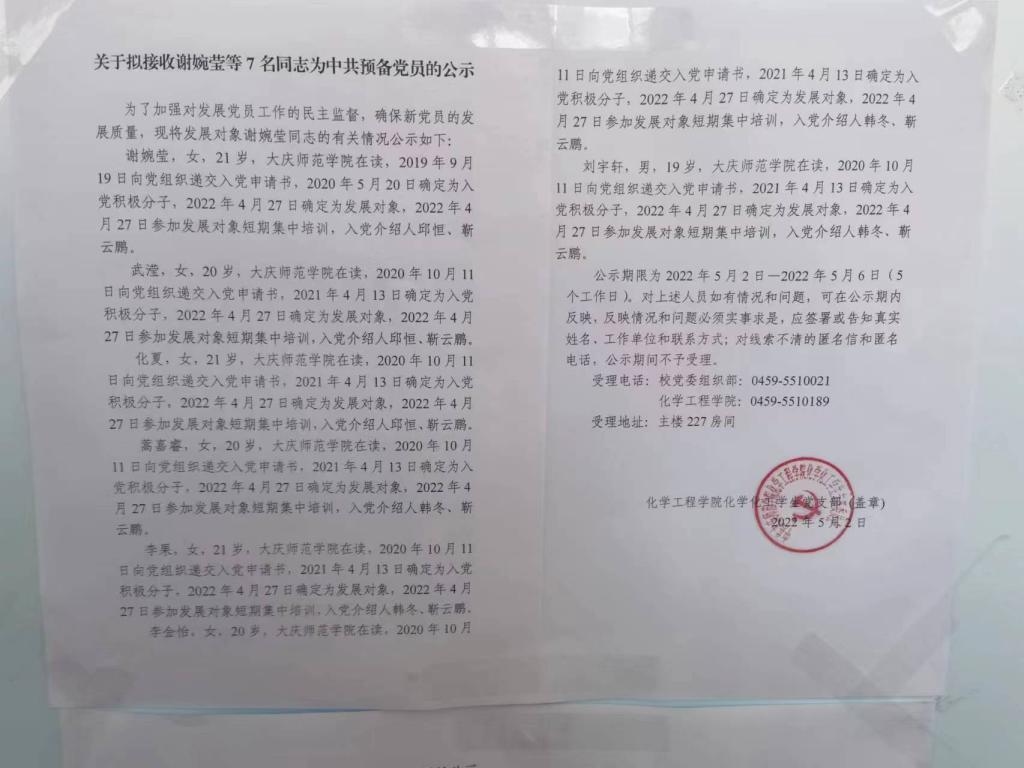 化学工程学院2022年上半年发展党员公示