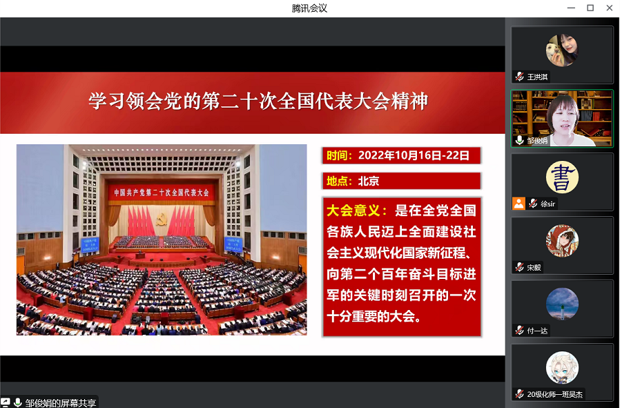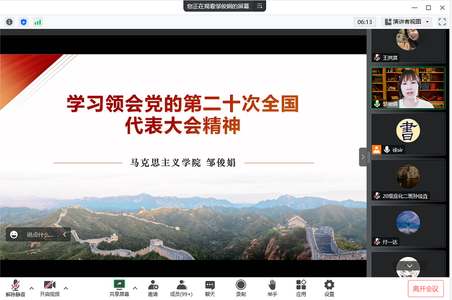 宣讲会上,马克思主义学院邹俊娟老师以《谱写新时代中国特色社会主义更加绚丽的华章》为题,重点围绕党的二十大的主题及主要成果、过去5年工作和新时代10年的伟大变革、马克思主义中国化时代化、中国式现代化、全面建设社会主义现代化国家的目标任务、坚持党的全面领导和全面从严治党、应对风险挑战等7个方面,对党的二十大精神进行了全面、系统、深入的解读辅导。