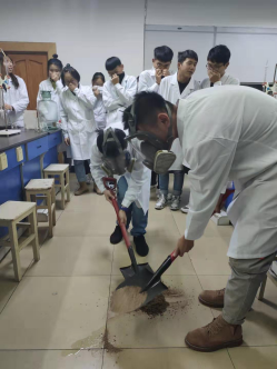 实验中心主任唐龙为老师和同学们讲解了危险化学品演练的重要性、学院防护设施布局、各种防护设备的使用说明以及如何处理危险化学品紧急突发事件等安全知识。随后由学生们开展了危险化学品演练。