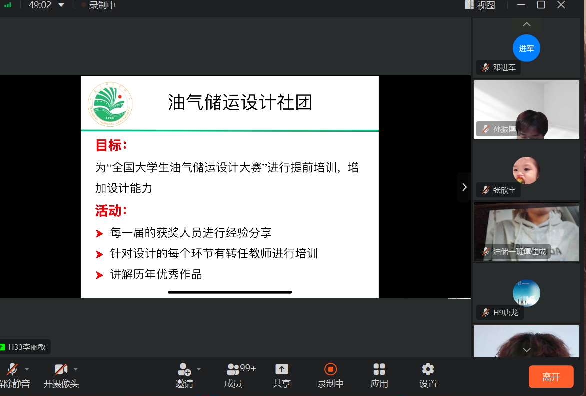 此次宣讲会形式多样、生动有趣,既有指导教师对专业社团的精彩讲解,也有同学们的热情提问。首先,石油与化工科技社团由高清河教授指导,社团充分利用技术和人才优势,积极开展创新设计方面的学科竞赛,并且曾于2019年获得大庆市“优秀学生社团”的荣誉称号。社团旨在提高学生的工程设计能力、自主学习能力、创新能力、团队协作素质以及沟通能力,培养造就一大批创新能力强、适应社会经济发展需要的优秀工程科技人才。随后,化工创新社团指导教师唐龙老师就社团概况向大家讲解,同时介绍了全国化工设计竞赛、互联网+比赛、“挑战杯”竞赛,提出关于平衡进入社团工作和学习的建议,同时鼓励同学们积极参加科研竞赛,学习专业知识,提升个人能力,并希望大家在大学生活绽放自己的光芒。随后,应用化学实践技能与创新社团指导教师邓进军老师进行了介绍,社团主要负责大创项目和学科竞赛等活动,参加社团活动与竞赛会带来意想不到的收获,丰富大家业余生活、收获最真挚的友谊、增强团队合作意识、提高社会适应能力。卓越名师社团指导教师鲁聪颖老师介绍了社团的人员结构与社团要求,社团开设三字训练、普通话训练与课堂教学设计,并介绍相关竞赛,希望大家在社团训练中提升自己,在大学生涯写出辉煌一笔。油气储运设计社团指导教师李丽敏老师介绍了社团概况并展示了社团近年来取得的优秀成果,并表示了对大家加入社团的期待。宣讲以“实践理论,发掘潜能,营造学术氛围”为主题,让学生用科学的思维去观察、分析、实践和解决问题。让知识走向实践,让化学走进生活。培养具有专业知识,热爱化学的创新型人才。
