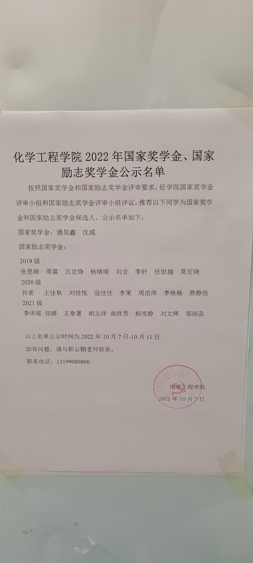化学工程学院 2022年国家奖学金、国家励志奖学金公示名单