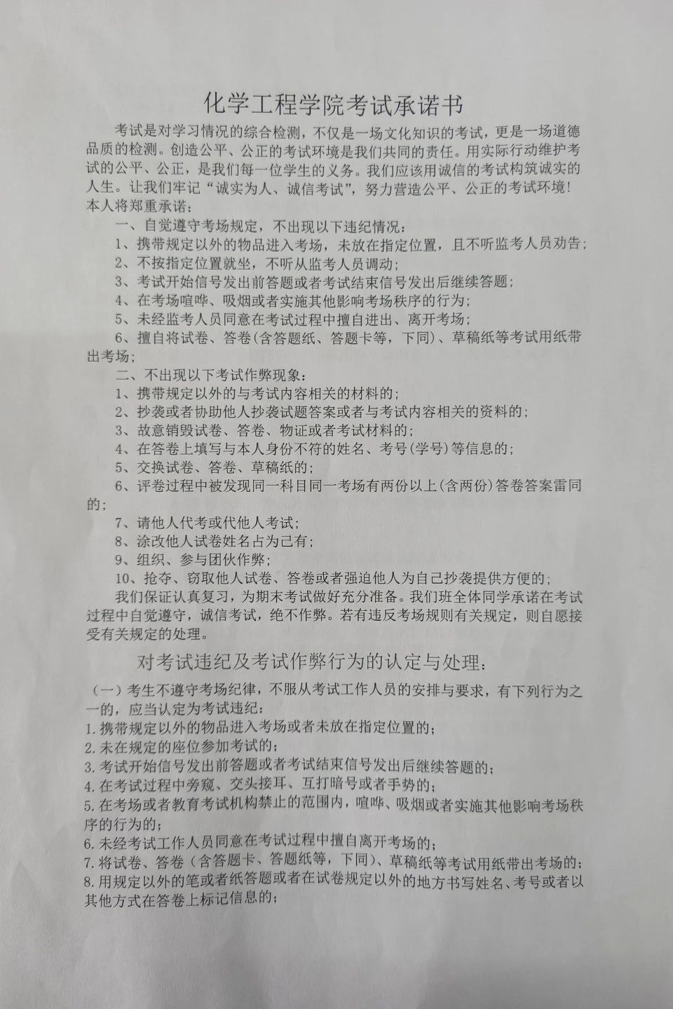 为进一步弘扬优良学风,切实维护教育教学秩序,化学工程学院于12月12日积极组织全体学生开展签署考试承诺书活动,将诚信教育落到实处,为即将来临的考试营造风清气正的良好氛围。