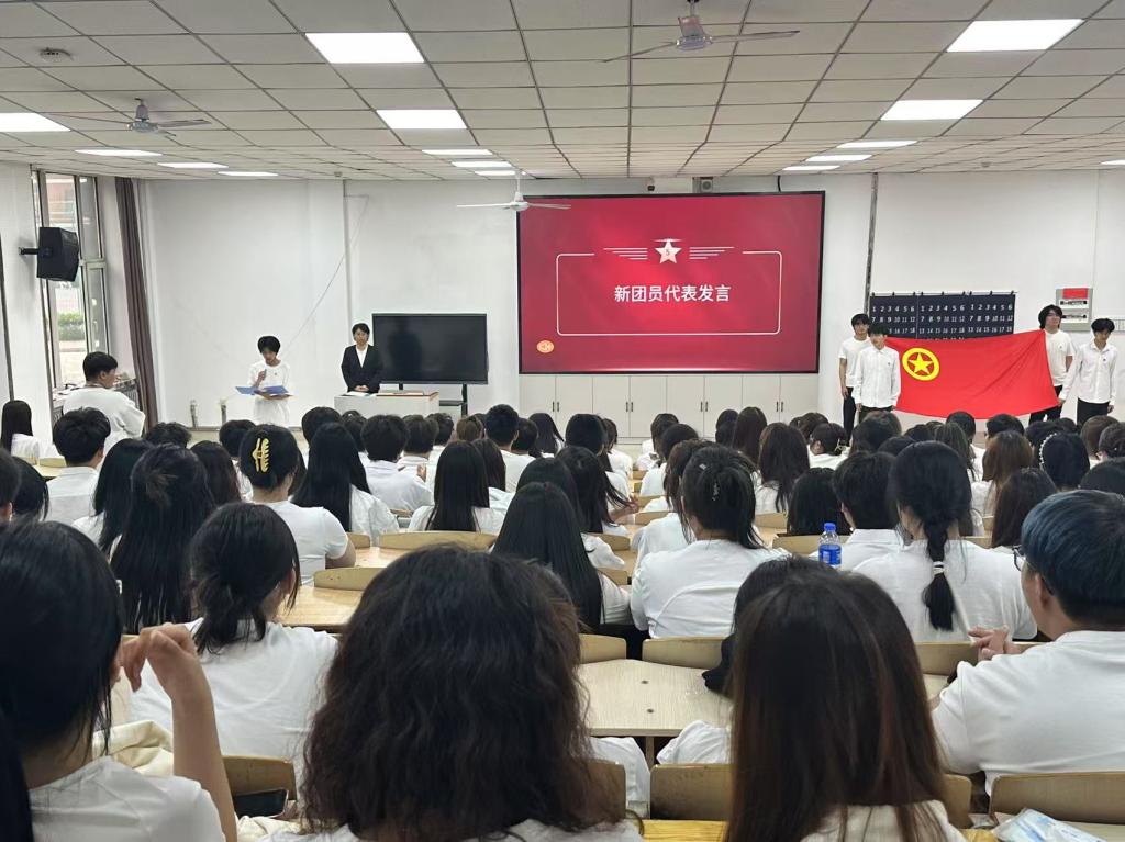 伴随着雄壮激昂的国歌声,入团仪式正式开启。韩冬老师宣读新团员名单后,老团员为新成员佩戴团徽。在庄严肃穆的氛围中,新团员们高举右拳,目光坚定,许下青春承诺。随后,新团员代表与优秀团员代表先后登台发言,他们纷纷表示,将以赤子之心热爱祖国,以拼搏之姿砥砺奋进,争做新时代的有为青年。随着团歌旋律响起,整场仪式在激昂的歌声中圆满结束。