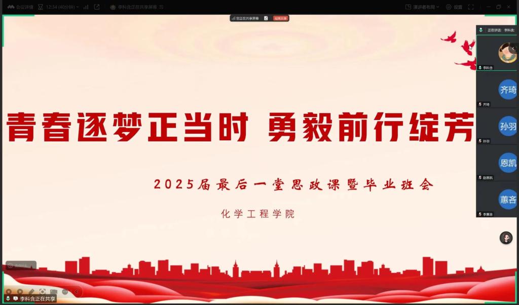 为扎实做好毕业生离校教育,引领2025届化院学子坚定理想、厚植家国情怀。化学工程学院组织2025届毕业生,通过线上形式参加“青春逐梦正当时 勇毅前行绽芳华”为主题的最后一堂思政课。本次课程由毕业生辅导员李科含老师主讲,全体2025届毕业生参与学习。