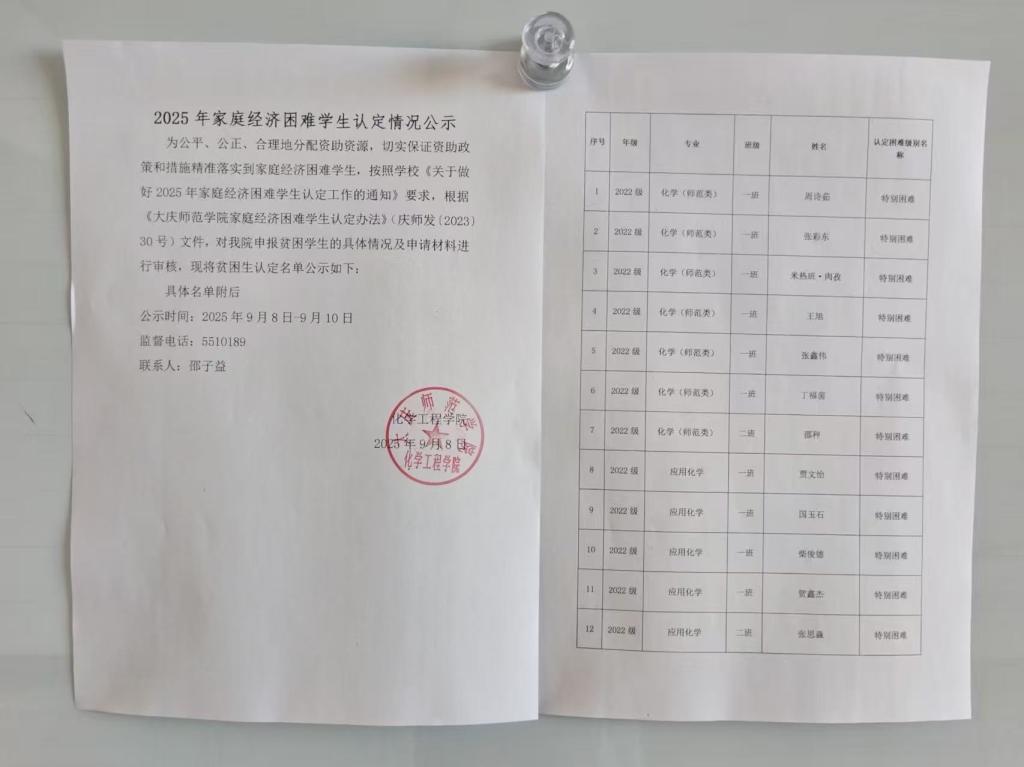 化学工程学院2025年家庭经济困难学生认定情况公示