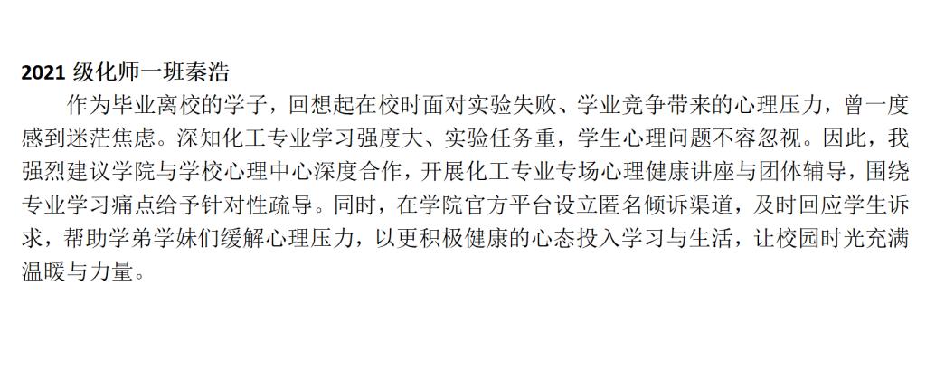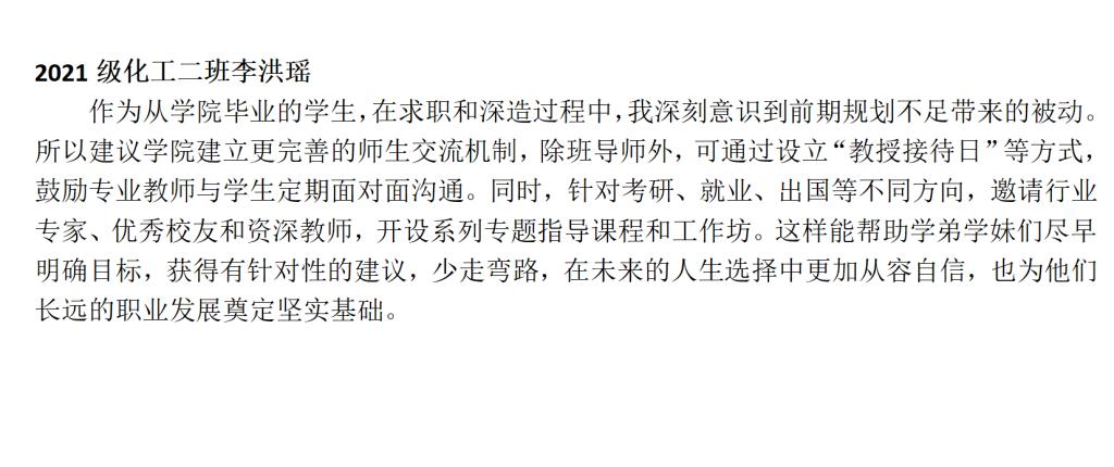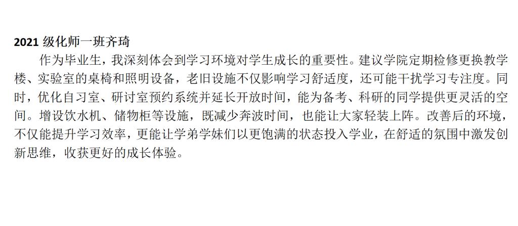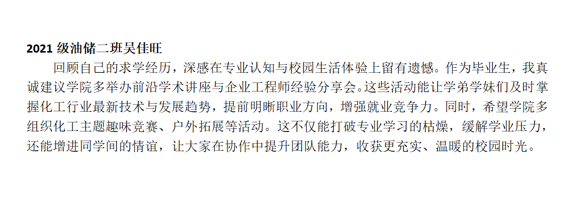 自活动开启以来,2025届毕业生们踊跃参与、各抒己见,以主人翁的姿态积极投身到为学院发展建言献策的行动中。2021级化师一班秦浩同学关注心理健康,提议开展专业心理辅导、搭建匿名沟通平台;2021级油储二班吴佳旺同学着眼学术成长,呼吁增设前沿学术讲座、深化校企合作实践;2021级化工二班李洪瑶同学建议设立“教授接待日”等常态化交流平台,邀请多方力量开设考研、就业等专题指导课程,助力学弟学妹明晰职业方向;2021级化师一班齐琦同学聚焦学习环境改善,建议更新教学楼设施、优化自习室预约系统。一条条建议饱含着毕业生对学院的深厚情感与美好期待,为学院未来发展提供了极具价值的参考。