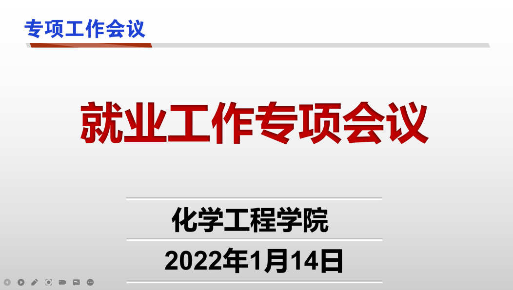 2022年1月14日上午9点30分,化学工程学院在线召开2022届毕业生就业工作专项会议,会议由院长高清河教授主持,会上党总支副书记徐宏书同志对当前学院2022届毕业生就业情况进行了汇报和分析,对学院制定的就业包保积分制标准和学校的就业奖惩文件进行了详细的解读,会后高院长做了重点强调,要求建立全员就业育人的理念,对各位老师的包保情况要定期进行公示,确保高质量完成2022届毕业生的就业工作。