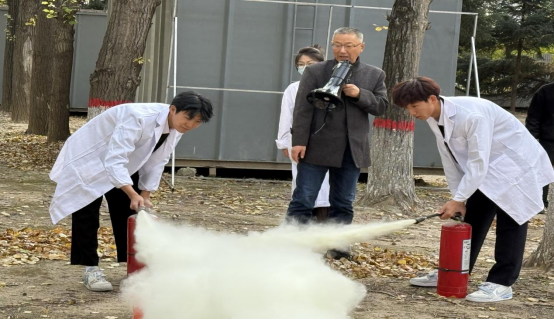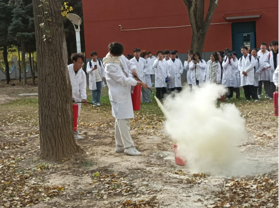 灭火演练环节,苏立山科长详细讲解了化学实验室的灭火常识,并演示了灭火器的正确使用方法。紧接着师生们开展了实际操作演练,对指定地点进行灭火。整个演练过程紧张而有序,达到了预期的效果。
