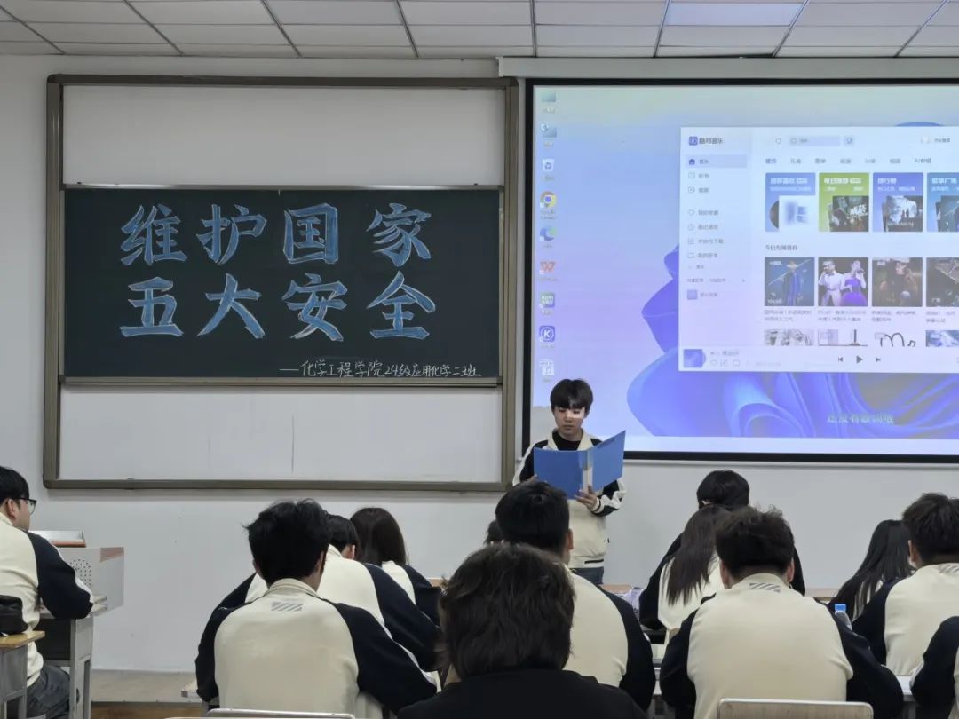 为了激发青年学子的爱国情怀与责任担当,促使同学们深入理解国家安全的核心价值,提升同学们对复杂安全形势的认知水平。4月15日,化学工程学院举办了维护国家“五大安全”主题班会活动。