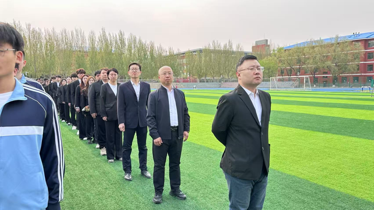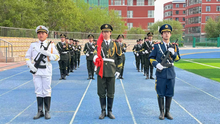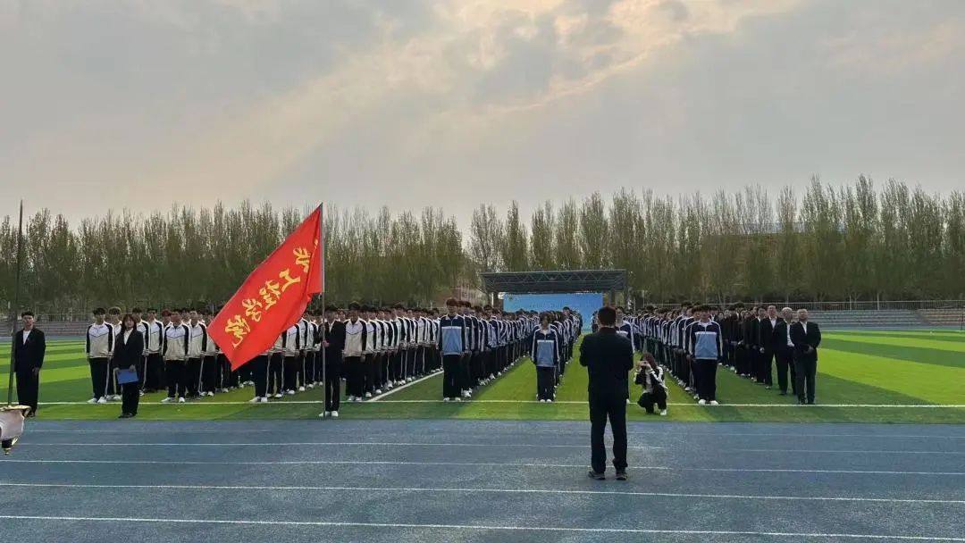 国旗护卫队迈着铿锵有力的步伐,整齐列队护送国旗入场。国歌奏响,五星红旗冉冉升起,全体师生整齐肃立,向国旗行注目礼。