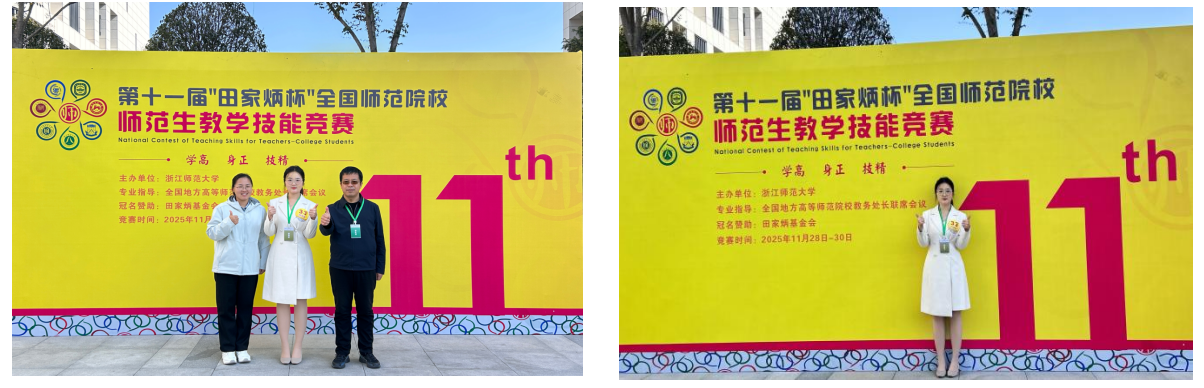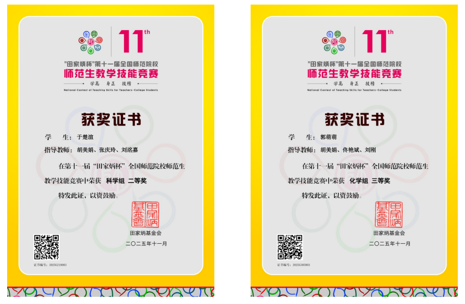 近日,在第十一届“田家炳杯”全国师范院校师范生教学技能竞赛决赛中,我院2023级化学专业于楚渲、郭萌萌两位同学凭借扎实的专业素养、清晰的教学思路和出色的现场表现,分别荣获“全国师范生教学技能竞赛二等奖”和“三等奖”。此次获奖充分展现了我院师范生培养的高质量,凸显了化学专业在教学实践中的深厚积淀与创新探索,体现了我院在师范生技能训练及师德育人等方面的工作成果。