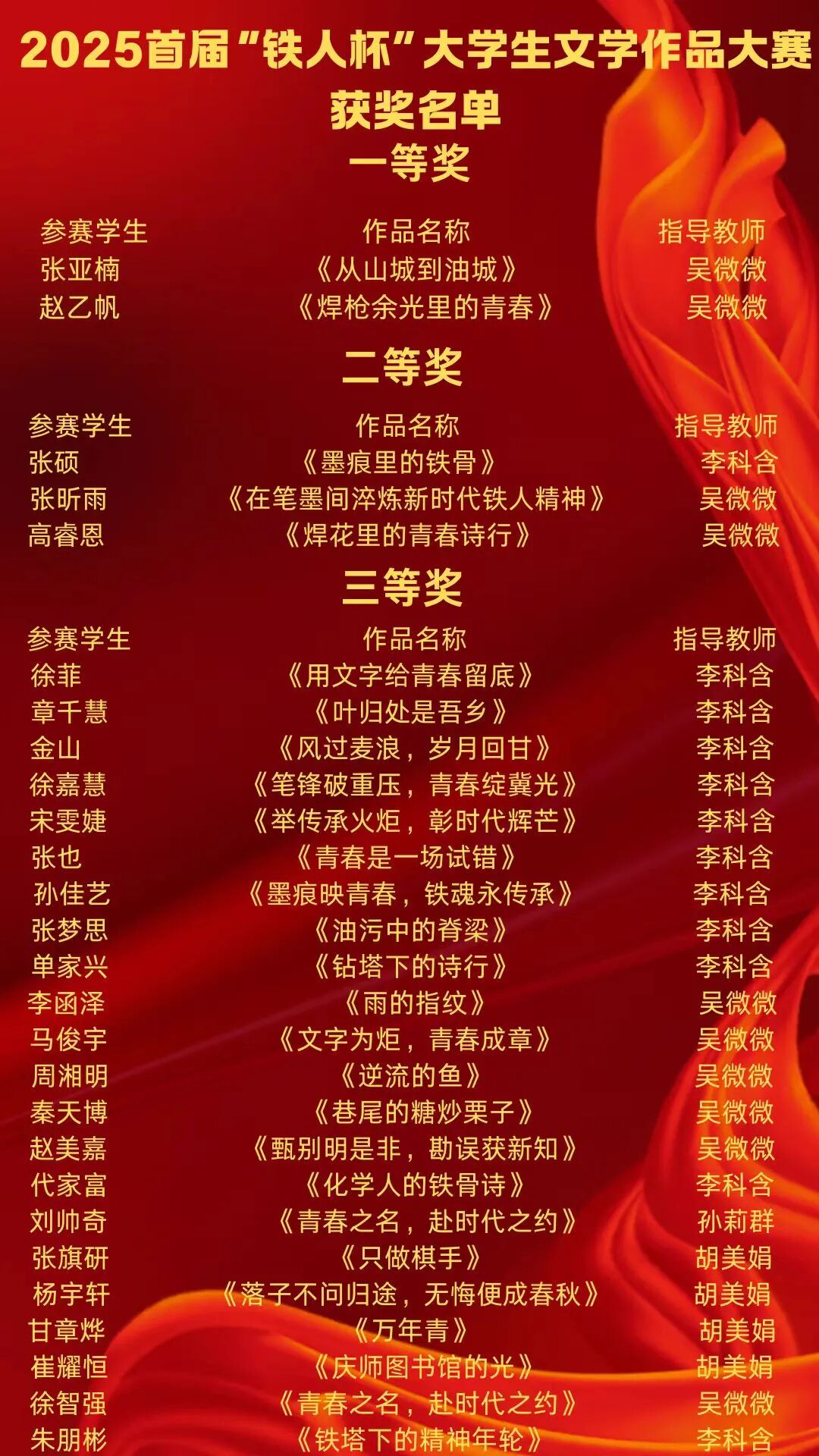 同期举办的“铁人杯”大学生文学作品大奖赛以“传承铁人精神,书写青春华章”为核心,面向全校学生征集诗歌、散文、小说等多种体裁的文学作品,旨在激发学生的文学创作热情,培育深厚的人文素养与家国情怀。