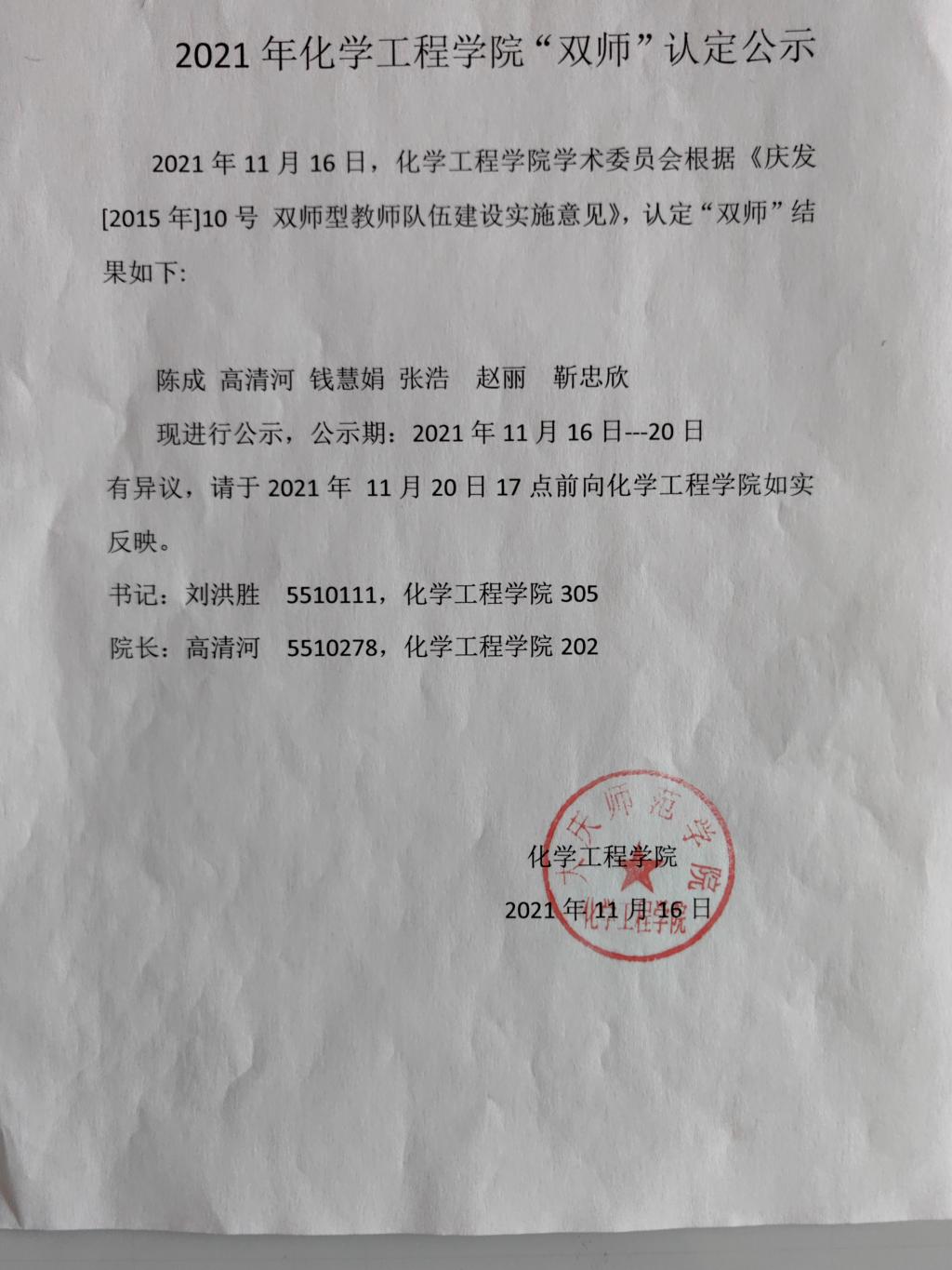 2021年化学工程学院“双师”认定公示