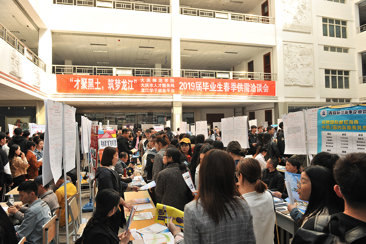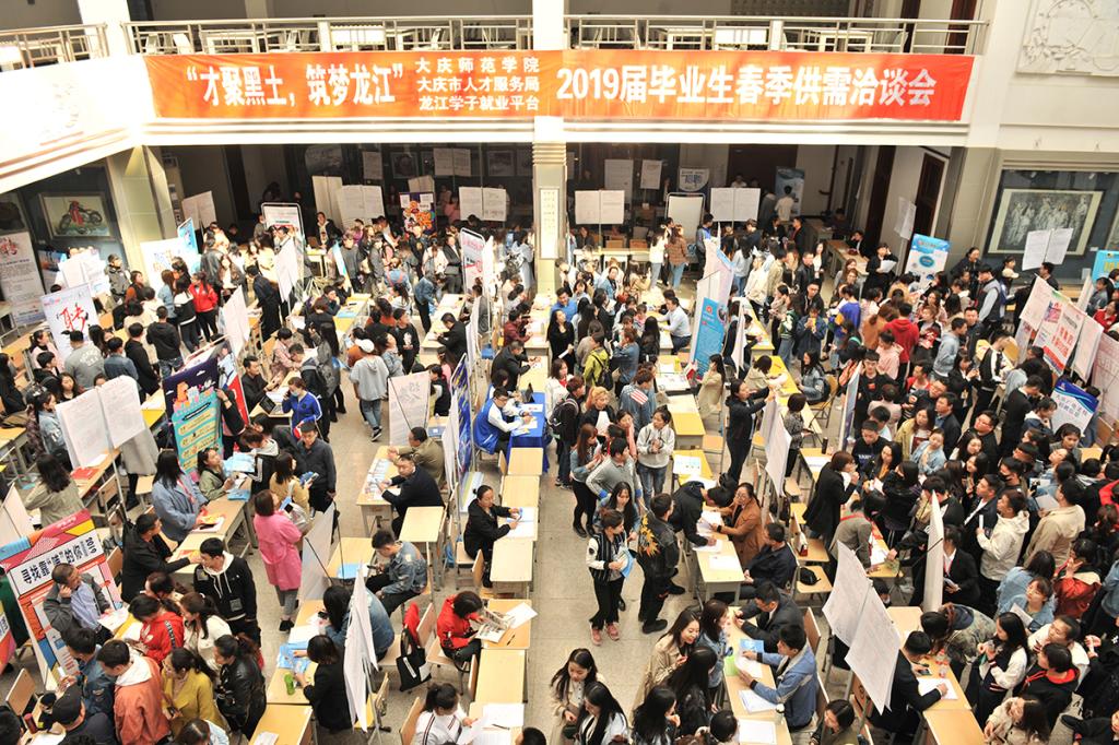 4月24日,我校在图书馆举办“才聚黑土,筑梦龙江”2019届毕业生春季大型供需洽谈会。
