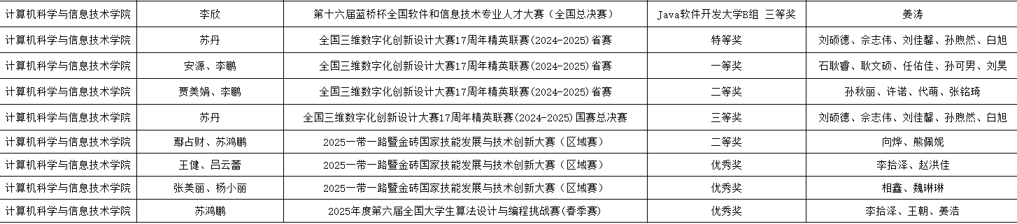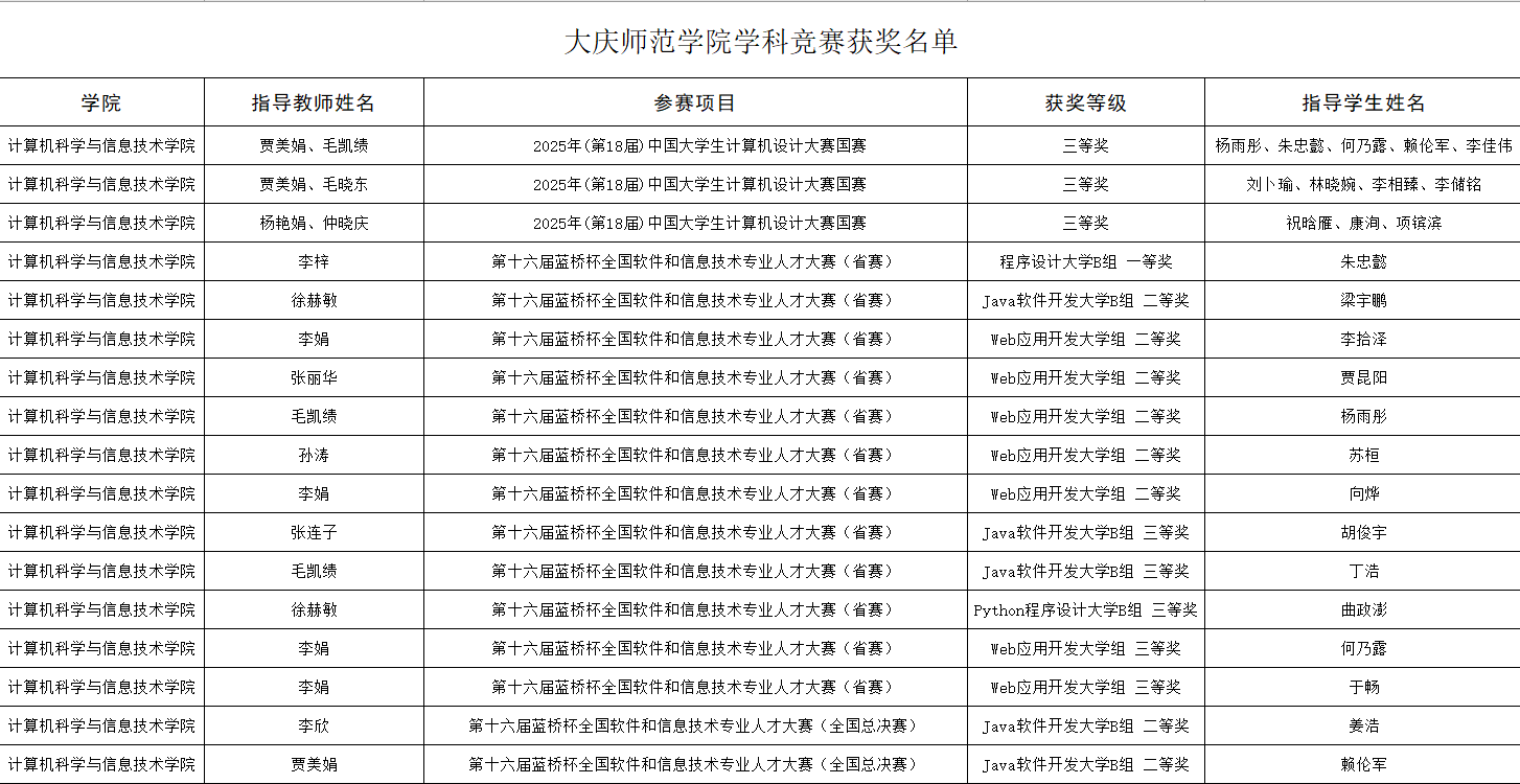 计算机科学与信息技术学院在第18届中国大学生计算机设计大赛国赛斩获3项三等奖;“蓝桥杯”省赛斩获一等奖1项、二等奖5项、三等奖5项,全国总决赛再添2项二等奖、1项三等奖。一带一路暨金砖国家技能赛区域赛:二等奖1项、优秀奖2项,国际舞台再露头角。全国三维数字化创新设计大赛17周年精英联赛,省赛特等、一等奖尽收囊中,国赛总决赛勇夺三等奖,3D世界的“庆师名片”愈发闪亮!