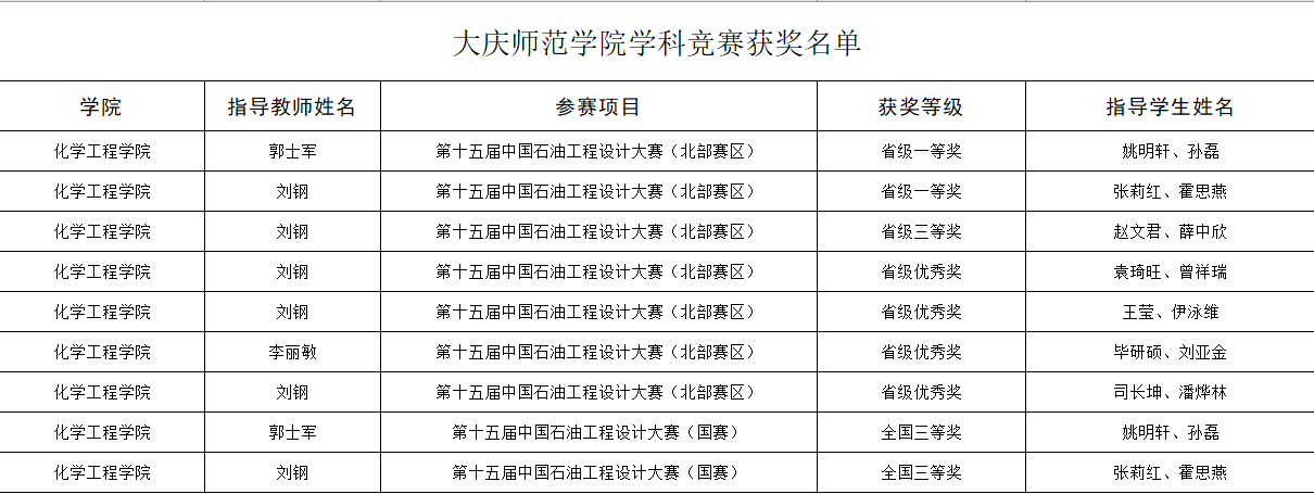 化学工程学院在第十五届中国石油工程设计大赛北部赛区中,勇夺一等奖2项、三等奖1项、优秀奖4项,国赛再获全国三等奖;能源强国的赛道上,庆师“后浪”正全力奔跑。