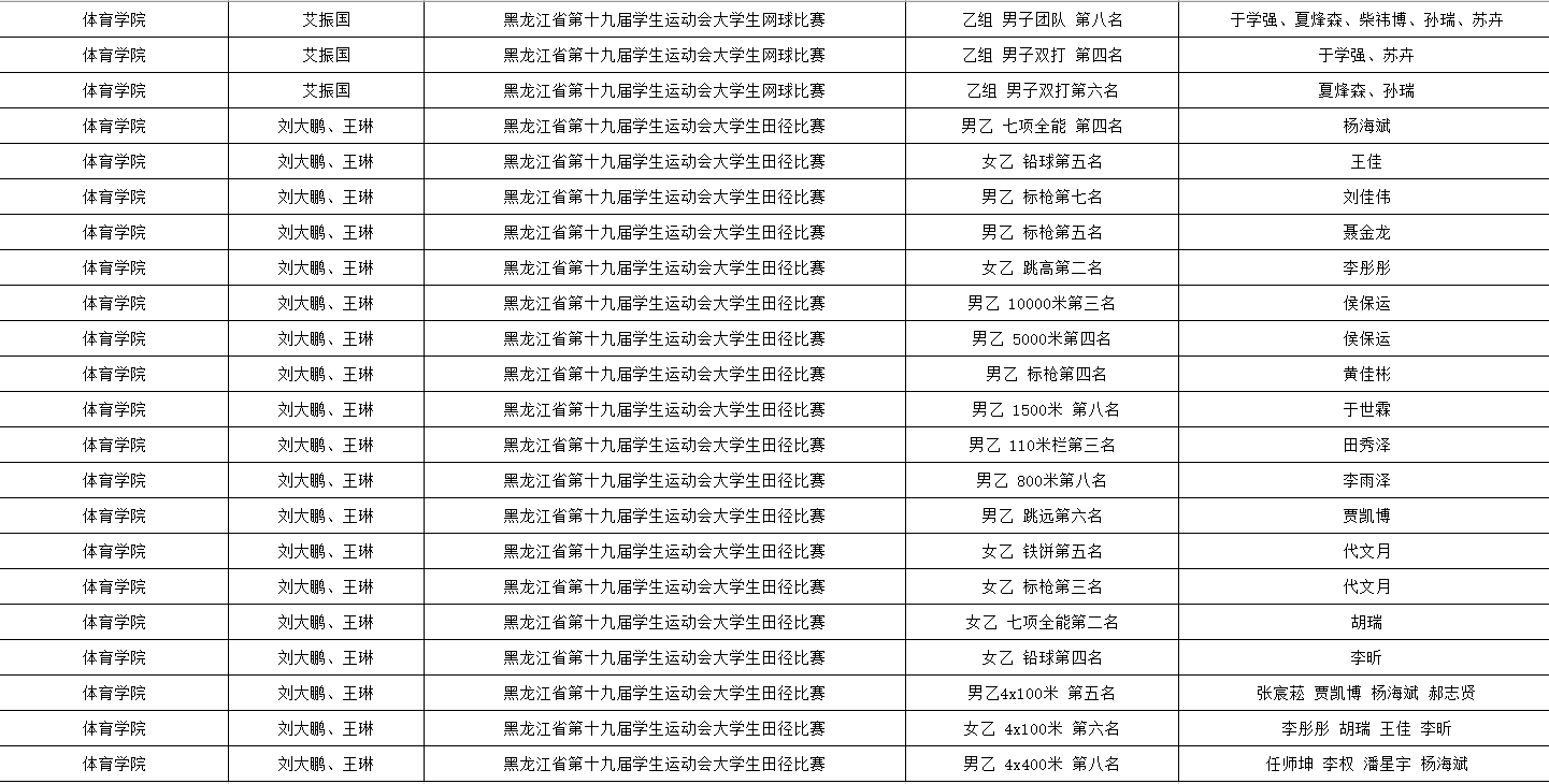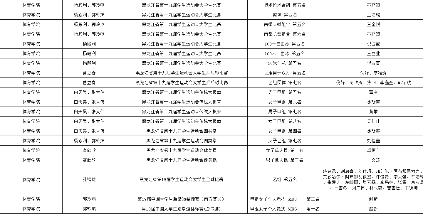 体育学院在全国健身瑜伽公开赛(驻马店站)斩获专业院校组集体徒手第3名、混双第6名、第7名及个人段位组二等奖9项;大学生龙舟赛公开组200米直道竞速二等奖,劈波斩浪,奋楫者先。黑龙江省第十九届学生运动会上,健美操女子单人操勇夺桂冠,男子单人操摘铜;武术赛场刀术、棍术、南拳捷报频传;大学生田径比赛:勇夺2枚银牌、5枚铜牌,4×100米、4×400米等项目全面开花;游泳、乒乓球、网球、足球等项目累计斩获20余项前八名,用汗水诠释“铁人精神”。跆拳道国赛总决赛,甲组女子-62公斤级霸气登顶!