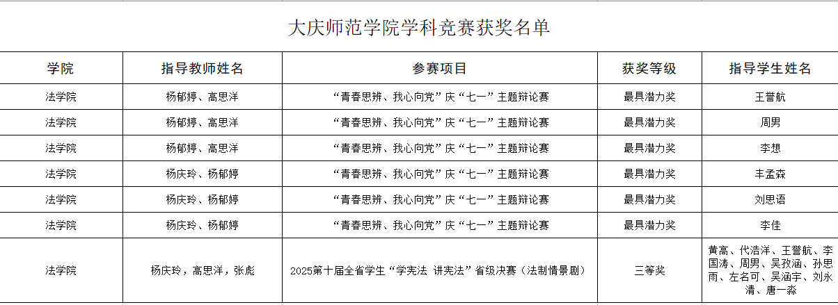 法学院在“青春思辨·我心向党”七一主题辩论赛中,6位同学荣获“最具潜力奖”;第十届全省学生“学宪法 讲宪法”省级决赛,法学院情景剧荣获三等奖,用法治之声讲好青春故事。
