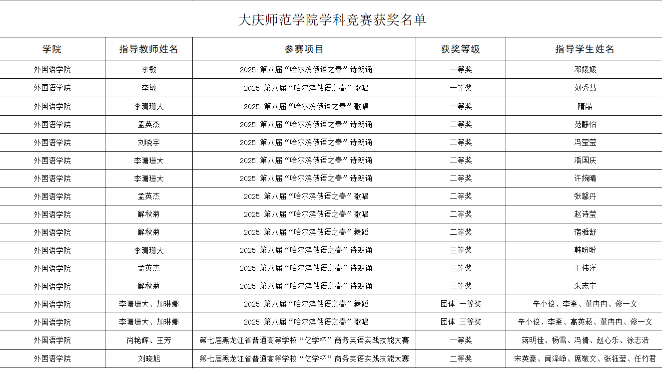 外国语学院在第八届“哈尔滨俄语之春”国际大赛中,朗诵、歌唱、舞蹈三大赛道齐发力,揽获一等奖5项、二等奖5项、三等奖4项,团体一等奖1项,以诗与歌讲好中国故事。第七届黑龙江省“亿学杯”商务英语实践技能大赛,包揽一等奖、二等奖,用英语打开世界窗口,用专业链接全球。
