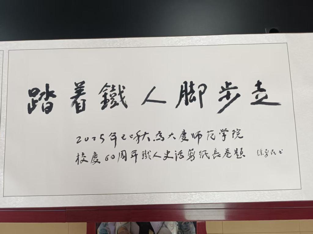 交流会后,徐勇民为我校校庆60周年铁人史话剪纸长卷题写长卷卷首:“踏着铁人脚步走”。