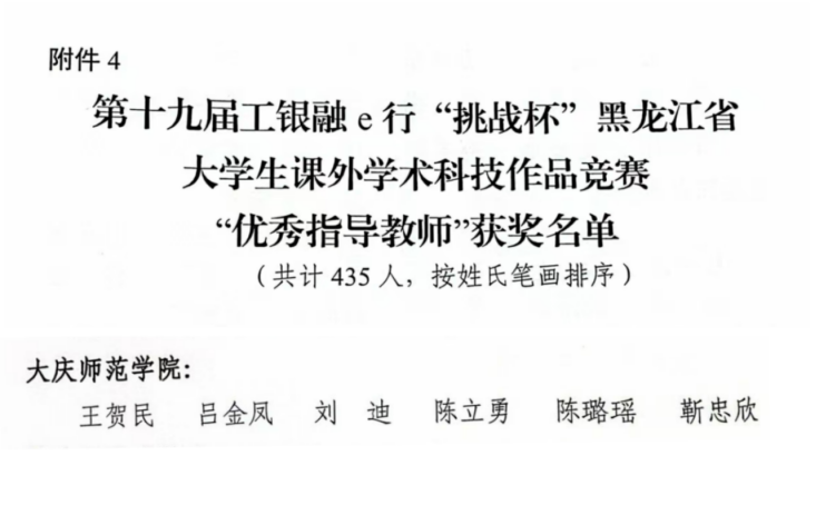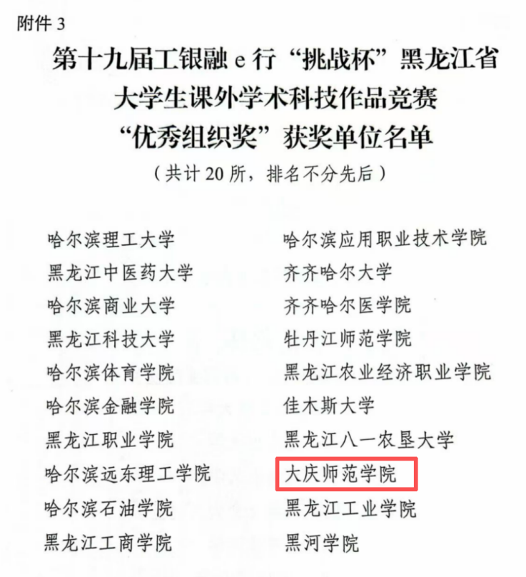 近日,团省委、省教育厅、省科技厅、省社科院、省科协、省学联联合发布《关于表彰第十九届工银融e行“挑战杯”黑龙江省大学生课外学术科技作品竞赛获奖集体和个人的决定》。我校在本届竞赛中表现优异,获省级一等奖3项、二等奖4项、三等奖4项,6名教师获评“优秀指导教师”,学校荣获“优秀组织奖”,获奖数量创历史新高。