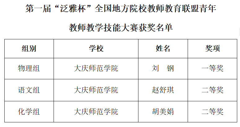 10月28日,由全国地方院校教师教育联盟举办的第一届“泛雅杯”全国地方院校教师教育联盟青年教师教学技能大赛圆满落幕。我校3名教师分别荣获一等奖1项,二等奖2项。