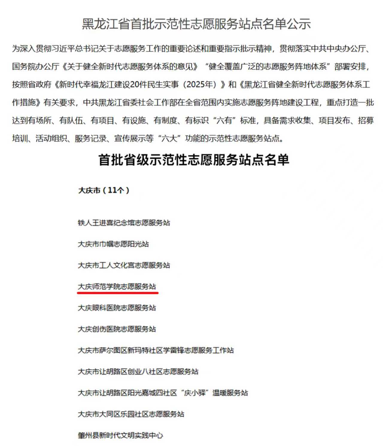 我校将以此次荣获省级示范性志愿服务站点为契机,持续深化志愿服务品牌建设,完善“规范化管理、专业化赋能、特色化发展”的工作机制,推进志愿服务与人才培养、社会需求的深度融合,打造更多具有影响力的志愿服务项目,为龙江全面振兴与社会发展贡献更多庆师力量。(来源:团委 撰稿:吕金凤 审核:王贺民 编辑:姜丰翼)
