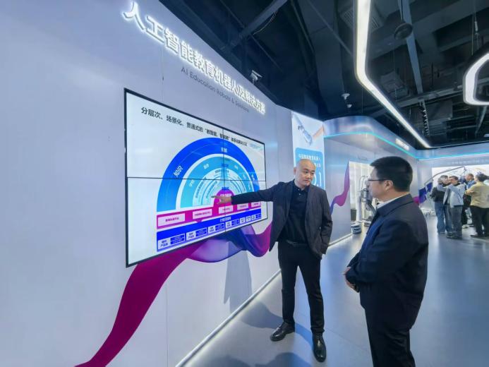 在优必选科技考察期间,张平同优必选科技教育副总裁于世杰展开深入交流,在“具身智能+教育”新模式、布局人工智能和信息科学等专业方向、联合开发中小学AI科普方案与科技教材、“贯通式科技教师培养链”构建等方面充分交换意见,为下步合作奠定坚实基础。
