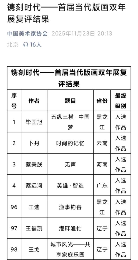 11月24日,由中国美术家协会、黑龙江省文学艺术界联合会联合主办,《美术》杂志社、黑龙江省美术家协会承办的“镌刻时代——首届当代版画双年展” 入选名单正式公布,美术与设计学院青年教师王迪的版画作品凭借鲜明的时代特色、精湛的艺术技法与深刻的思想内涵成功入选,彰显了我校青年教师在专业创作领域的扎实功底与创新活力。