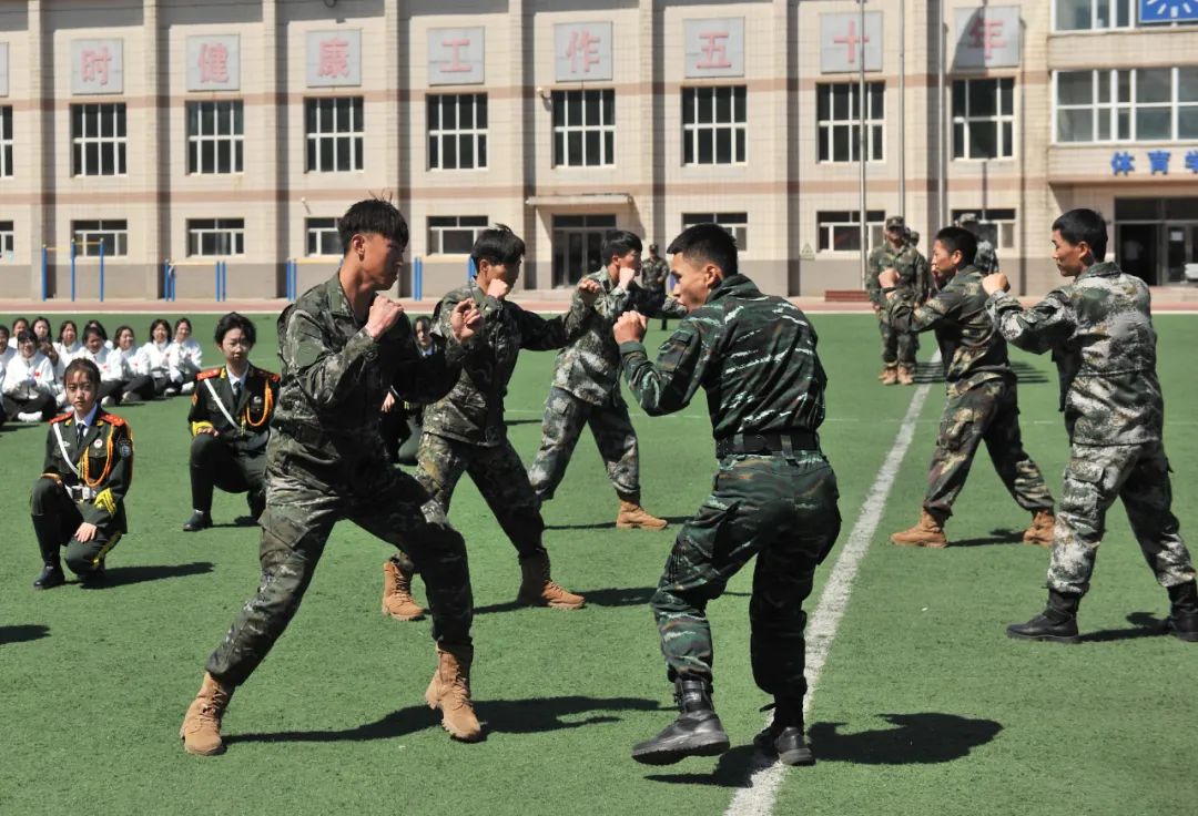学生军训教官队列队形表演队和战术动作表演队在呐喊声中逐一登场,精彩亮相。他们气势磅礴,热血铿锵,我校军训教官团均由退役大学生士兵组成,正所谓“退役不褪色,整装再出发。”