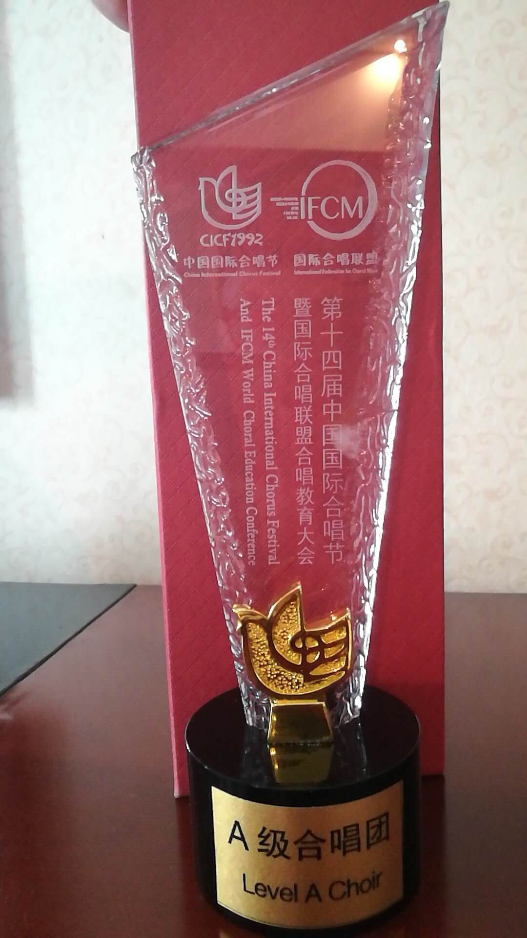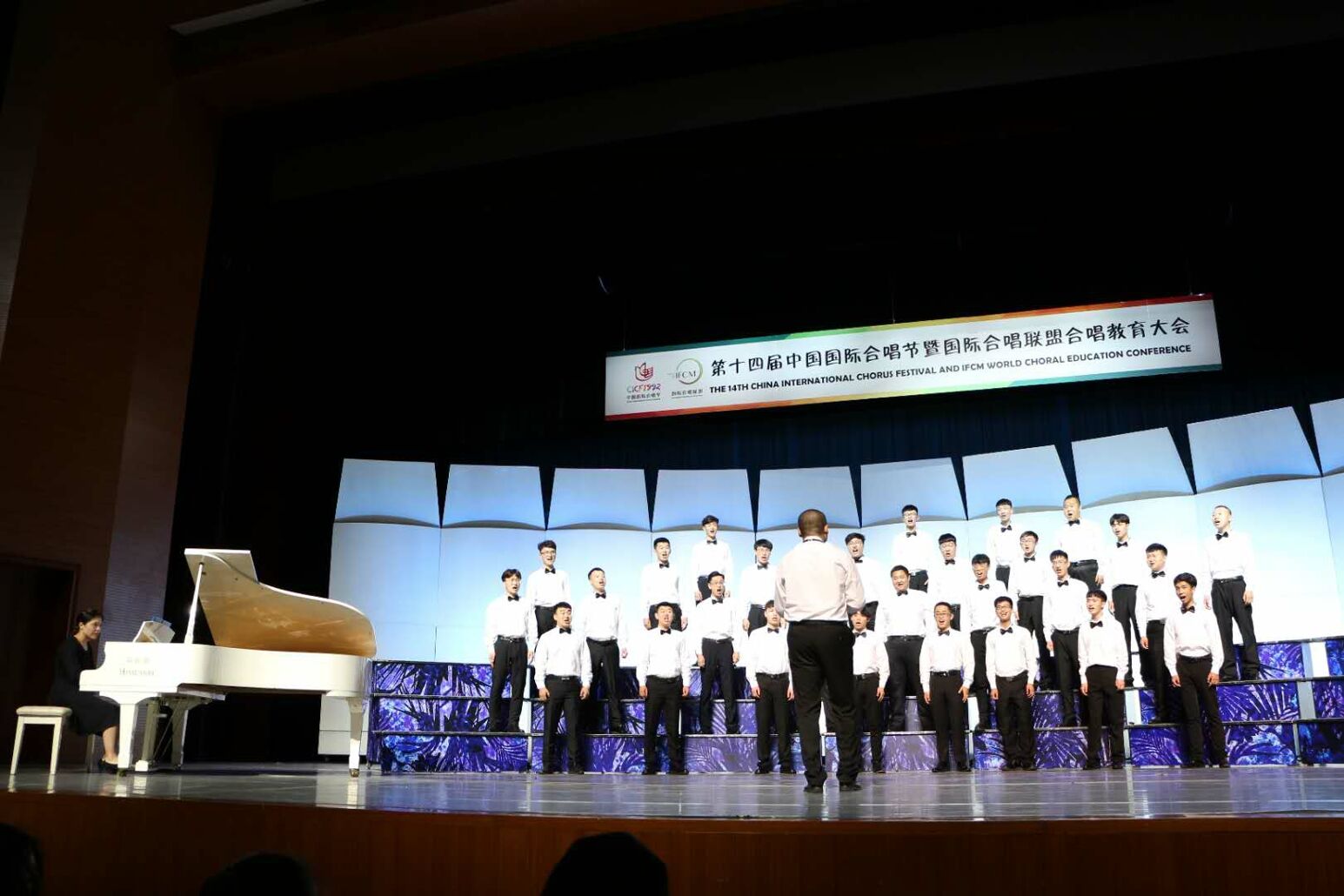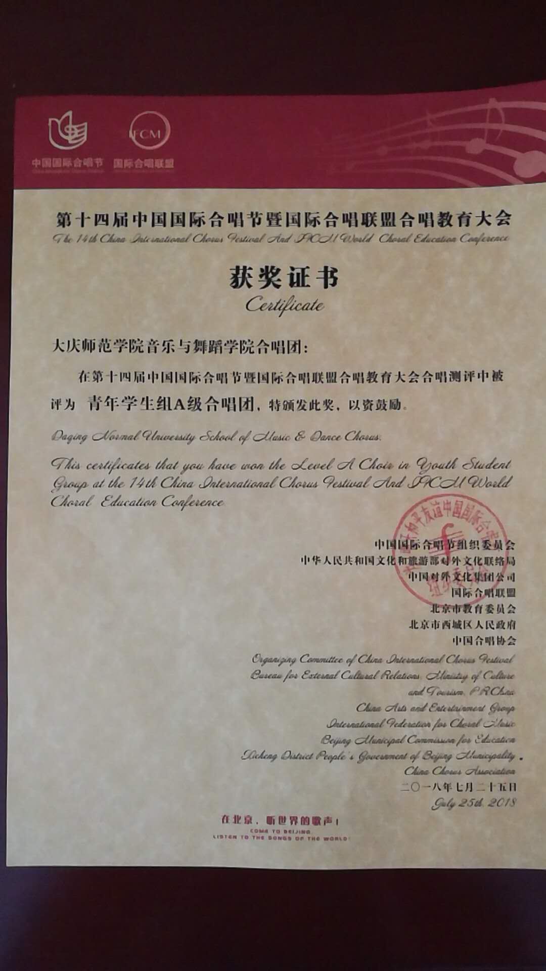 2018年7月24日10:00,第十四届中国国际合唱节颁奖典礼在北京九华山庄举行,我校音乐与舞蹈学院合唱团凭借出众的音准、优美的音色,尽显男声合唱的魅力,摘得青年学生组A级评定(此次比赛共设A,B,C,D四个等级,A级为最高等级)。