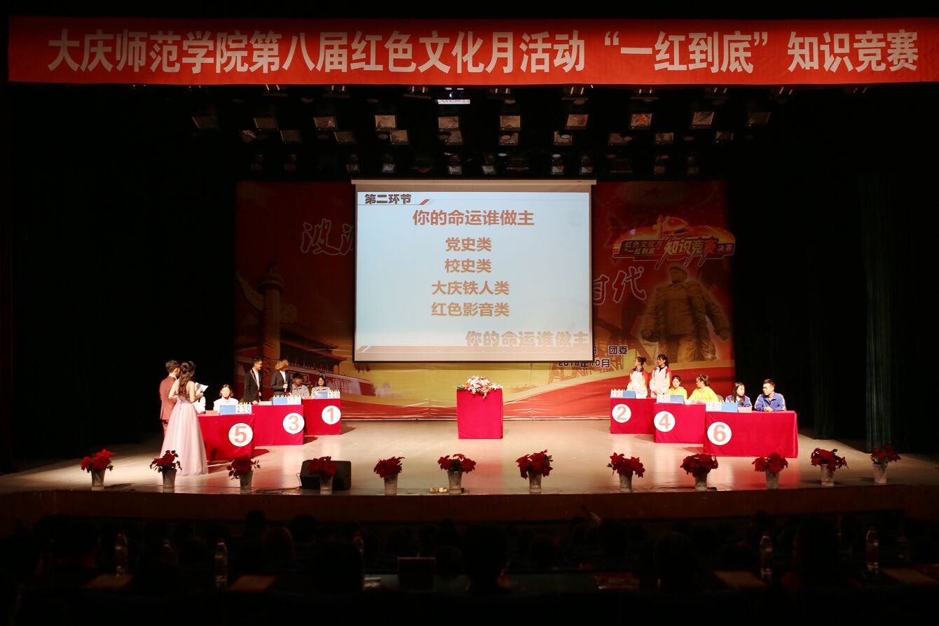 在经过初赛、复赛的激烈角逐后,文学院、生物工程学院、法学院、化学工程学院、体育学院、外国语学院六只代表队突出重围进入决赛。本次比赛以弘扬大庆精神、铁人精神,回顾、宣传改革开放四十年伟大成就为主题,围绕这一主题竞赛题目分为党史类、校史类、大庆精神铁人精神类和红色影音类,共有“验你行不行”、“你的命运谁做主”、“你将一红到底”三个竞赛环节。