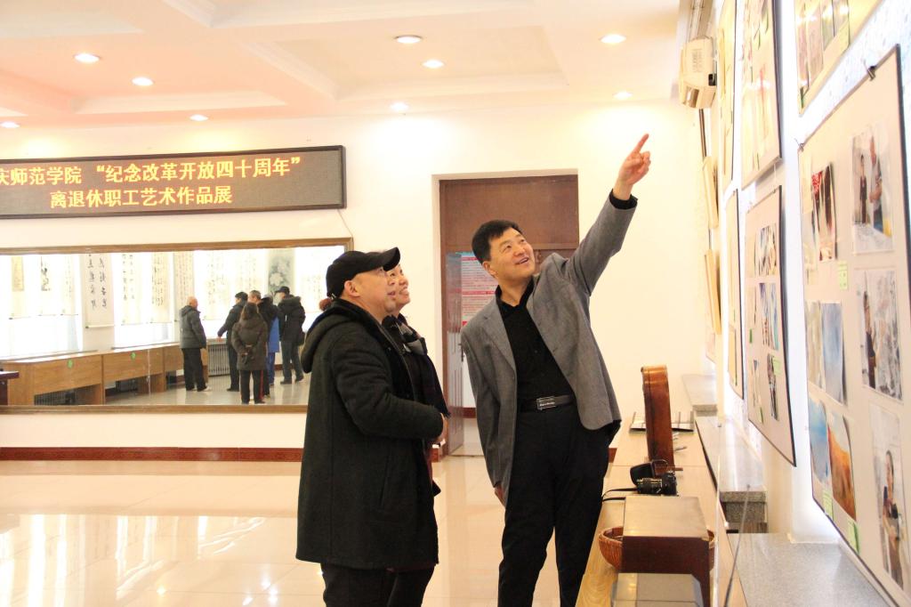 为庆祝改革开放40周年,2018年12月18日,离退休职工管理中心举办了以“庆祝改革开放四十周年”为主题的书法、绘画、摄影等艺术作品展。我校工会主席徐晓东、美术与设计学院师生与在场老同志们一起对作品进行观摩点评。