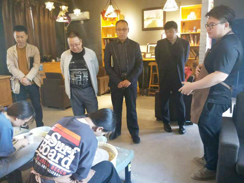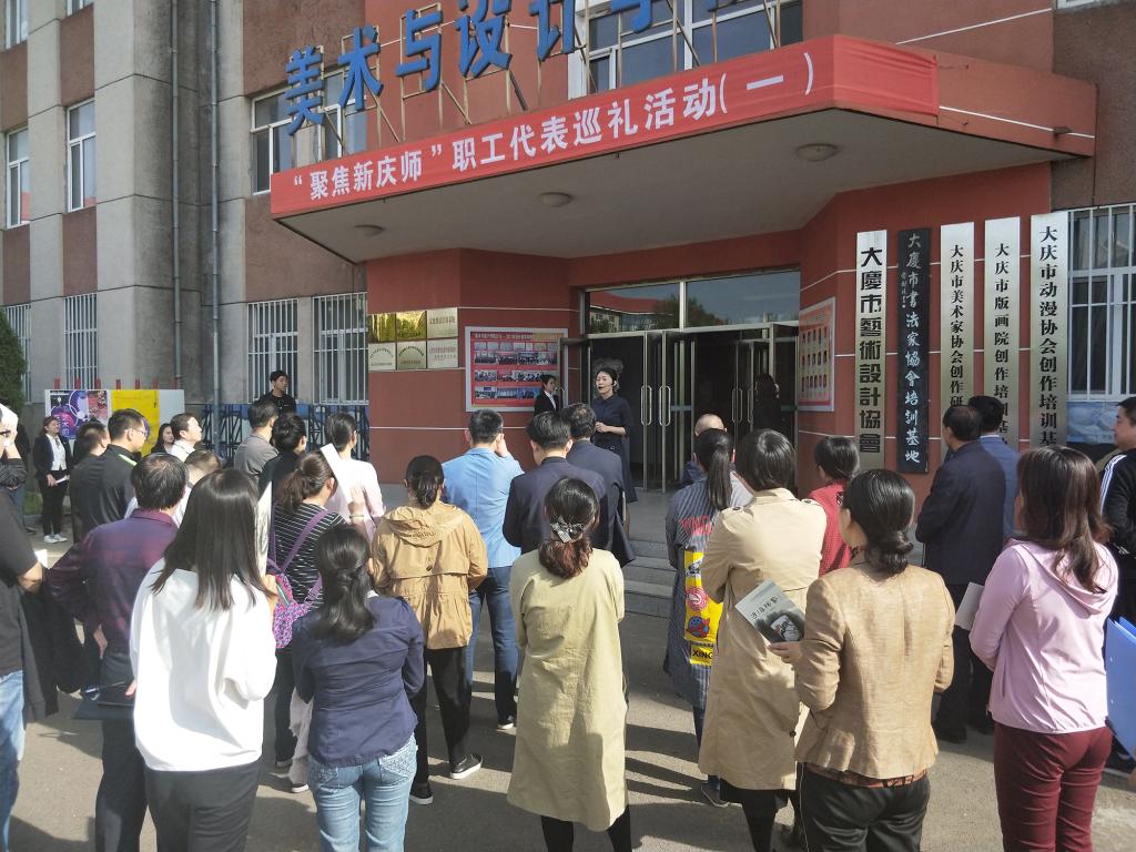 教职工代表考察了学校转型试点单位美术与设计学院。在图书馆,美术与设计学院工会主席孙琦带领职工代表考察了学生毕业设计成果展、美术教师石油工业主题作品陈列展、大庆油陶陈列室;在美术与设计学院教学楼参观了分画室和石油工业墙绘等;在美术与设计学院实训楼,张立翔老师带领职工代表考察了4个校企共建实训室,教师、学生作品陈列室;在陆津老师的带领下,职工代表考察了乐淘坊、商鲲3D打印实训室、银家工坊、初阳手绘工作室等5家校企共建实训室。