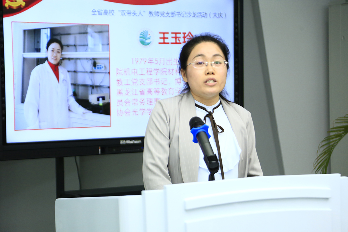 为贯彻落实全省高校“弘扬爱国奋斗精神、建功立业新时代”活动推进会精神,落实“百名支部书记谈保障”部署,2019年6月3日,由省委教育工委组织部主办,黑龙江八一农垦大学承办的全省高校教师党支部书记沙龙(大庆)在黑龙江八一农垦大学举行。我校机电工程学院材料科学与工程系教工党支部书记王玉玲博士代表学校参加本次沙龙活动。
