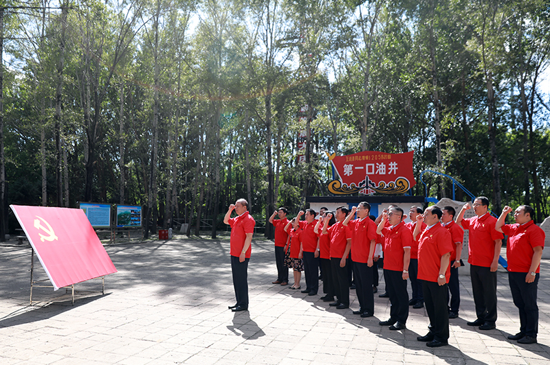 下午,中心组(扩大)成员来到大庆精神、铁人精神的发源地“铁人第一口井”井址,参观了大庆油田工业遗址展、铁人第一口井、地窝子、卸车台等遗址。聆听了学校全国高校思想政治理论课教师研修基地教师的现场教学,在“铁人第一口井”井址前,辛宝忠书记带领中心组(扩大)成员,面对鲜红党旗,郑重举起右手,重温入党誓词,再一次接受党性的洗礼。