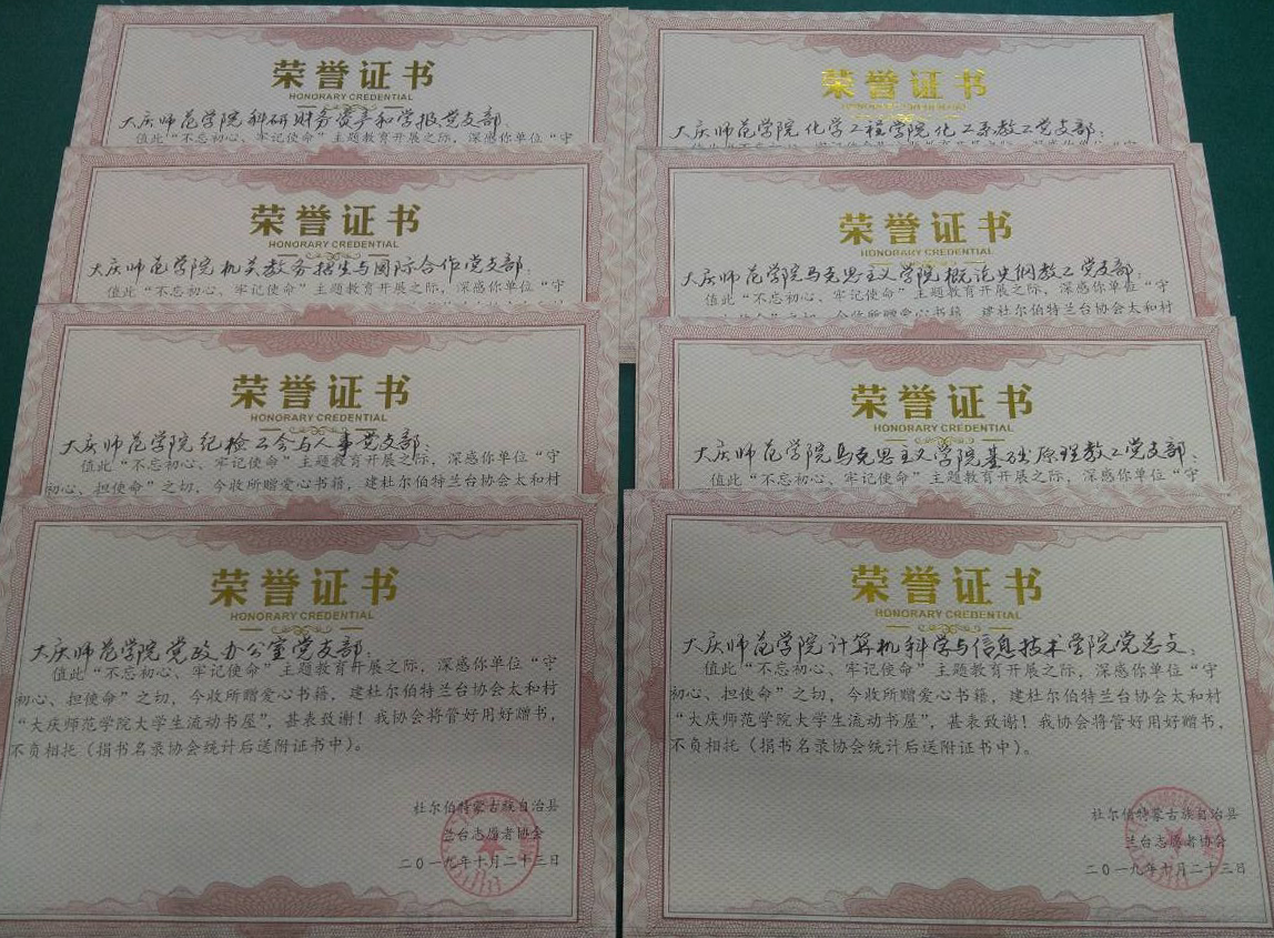 学校党委要求各党支部按照“不记初心,牢记使命”主题教育的要求,开展公益活动以来。校友会通过QQ、微信等自媒体,将校友提供的公益信息及时发布给各党组织。“大庆市杜尔伯特县兰台志愿者协会公益图书馆伽恩分馆”是在地方政府主管部门登记注册的一家民间公益组织。该组织主要是向社会爱心人士募集图书,捐赠给乡村中小学生流动阅读,满足贫困家庭孩子的读书、学习梦。公益信息发布后,得到了机电工程学院、计算机科学与信息技术学院、化学工程学院、马克思主义学院、机关党政办公室党支部、纪检工会与人事党支部、科研财务资产和学报党支部、教务招生与国际合作党支部积极响应。机电工程学院还组织学生党支部参与公益捐赠活动,共募集图书702册,其中机电工程学院材料科学与工程系教工党支部46册、电子信息工程系教工党支部41册、汽车服务工程系教工党支部33册、自动化系教工党支部37册,学生党支部545册。计算机科学与信息技术学院共募集图书161册,其中网络公共教工党支部89册、软件数媒教工党支部45册、计科物联网教工党支部27册。化学工程学院化工系教工党支部共募集图书77册。马克思主义学院基础原理教工党支部共募集图书22册;马克思主义学院概论史纲教工党支部共募集图书20册。机关党政办公室党支部共募集图书245册、纪检工会与人事党支部共募集图书92册、科研财务资产和学报党支部共募集图书117册、教务招生与国际合作党支部共募集图书80册。