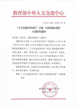 2019年11月7日教育部人文交流中心印发《“人文交流经世项目”首批“经世国际学院”入选院校通知》(人文中心函〔2019〕91号),按照“院校申报、企业对接、专家评审”的程序,遴选了22所本科院校和50所职业学院。我校成功入选“人文交流经世项目”首批“经世国际学院”项目本科层次合作院校。