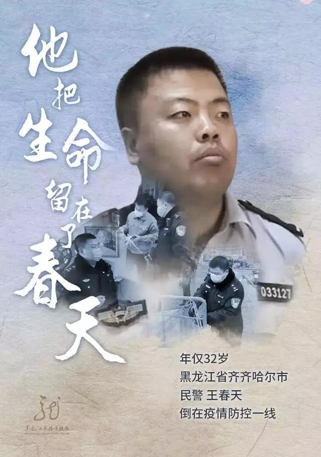 2020年2月11日15时许,黑龙江省齐齐哈尔市公安局铁锋分局新工地派出所四级警长,副所长王春天同志在齐齐哈尔市铁锋区平阳南苑小区执行疫情封控任务时,因劳累过度,突发心脏病晕倒在工作岗位,经抢救无效,不幸牺牲,年仅32岁。