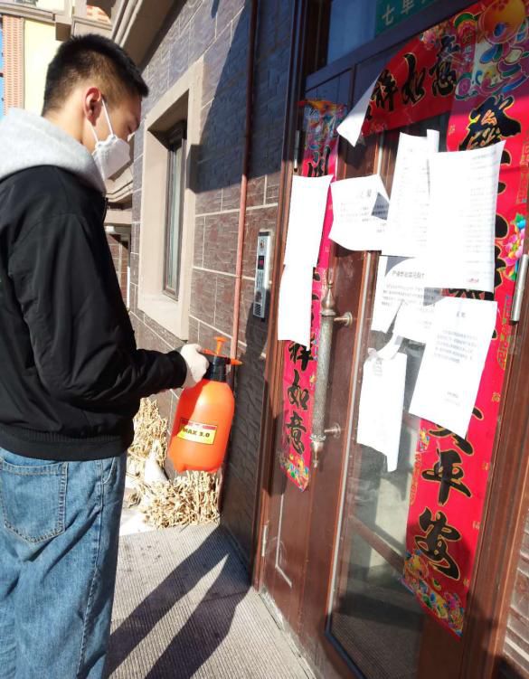 二月的东北室外温度零下二十多度,每一次执勤时间3至4个小时,他坚持在岗,严格把控,不疏忽、不漏人,严格执行小区封闭管理的每一项要求。小区公共区域卫生消毒,任务量非常大,小区的居民楼道,垃圾箱点以及健身器材都要进行全面消毒,于继来对每一个区域都认真负责,高效完成。在宣导过程中,他经常会遇到有部分市民不理解,这时更需要他用耐心、细心和热心去赢得支持。为了不让疫情蔓延,给国家减轻压力,不让龙江百姓受到这场传染病的干扰,他勇敢地站在了防疫前线。