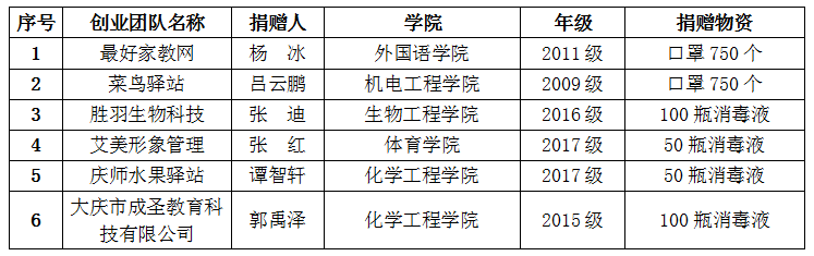 我校大学生创业者协会通过发布《助力母校 共攘疫情——创业团队抗疫捐赠倡议书》,积极倡议广大校友创业团队奉献爱心、捐助母校、戮力同心、抗击疫情。倡议书发布后,得广大校友创业团队的积极响应。三天时间,涌现出最好家教网、菜鸟驿站、胜羽生物科技、艾美形象管理、庆师水果驿站、大庆市成圣教育科技有限公司等6个创业团队捐赠防疫物资。