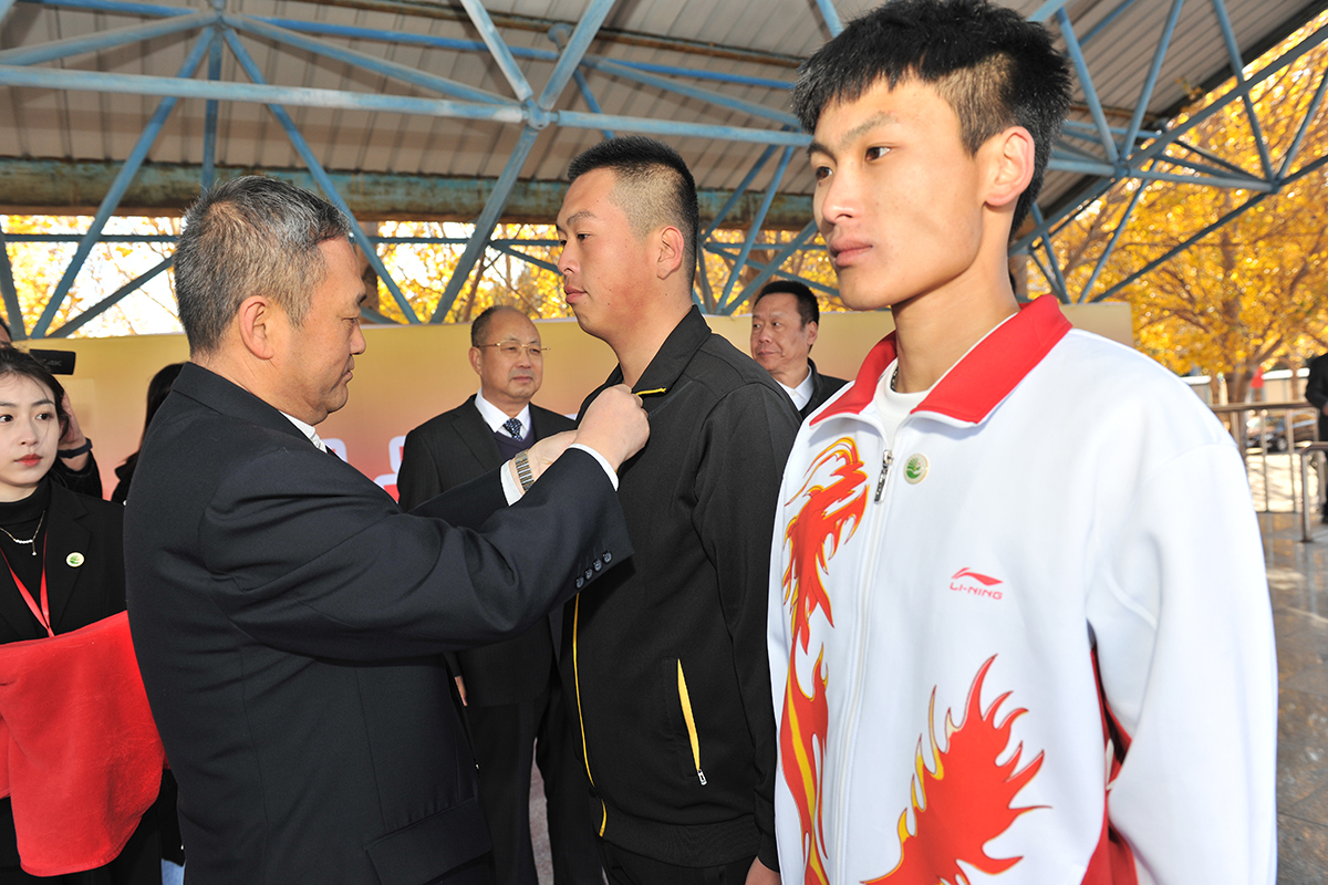 接着,党委书记徐克明为新生代表佩戴校徽。全体新同学也将庆师徽章佩戴在自己胸前。新同学佩戴这枚徽章,不仅代表庆师身份,更承载着庆师“自强不息,臻于至善”的精神。