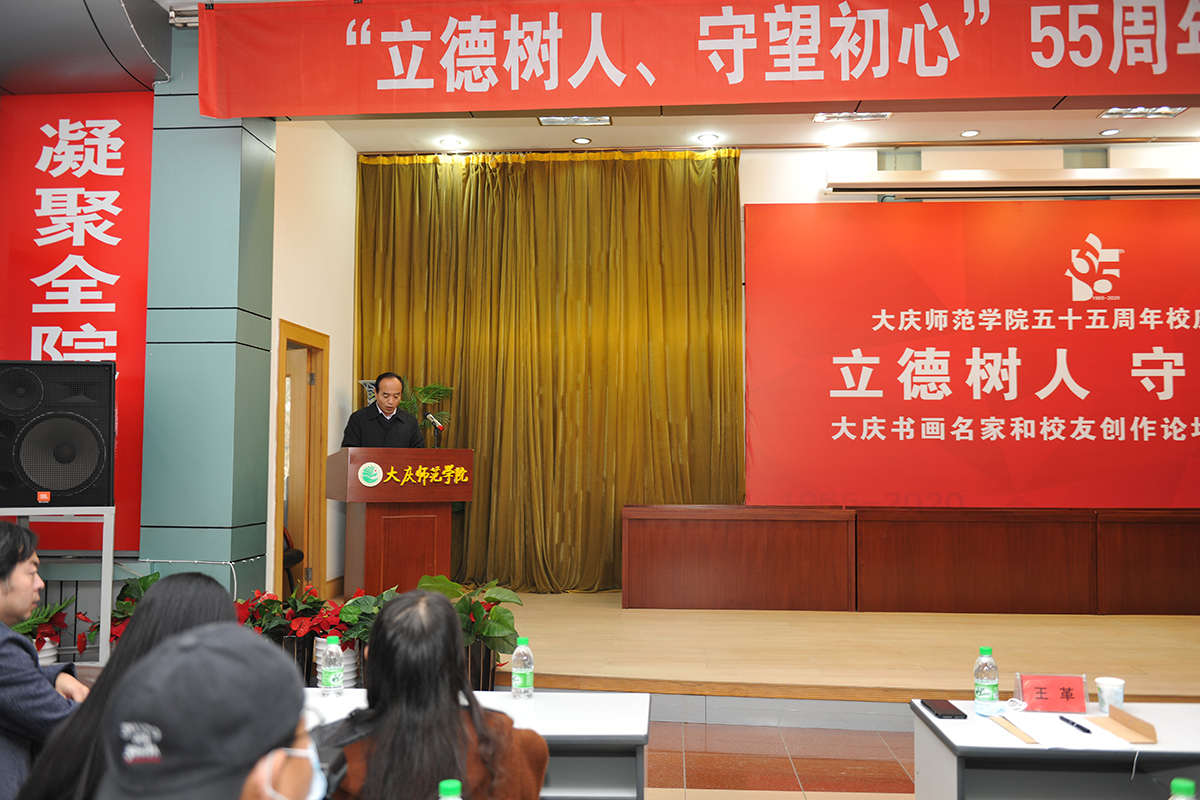 学校党委书记徐克明致辞,他代表学校向各位嘉宾、各位校友的到来致以热烈欢迎和诚挚感谢。他指出,学校举办本次论坛活动,就是要将学校55年来积累的人文艺术底蕴充分展示出来,发挥好大学的文化传承功能,彰显大学的人文情怀和育人宗旨。希望各位艺术家、校友和广大师生以学术研究、艺术创作及文化交流为基点,在本次“立德树人、守望初心--书画名家创作论坛暨笔会”系列活动中,挥毫泼墨抒发艺术情怀,情凝笔端歌颂盛世繁华,为油城和龙江的文化繁荣、中国传统文化的传承与发展做出更大的贡献。