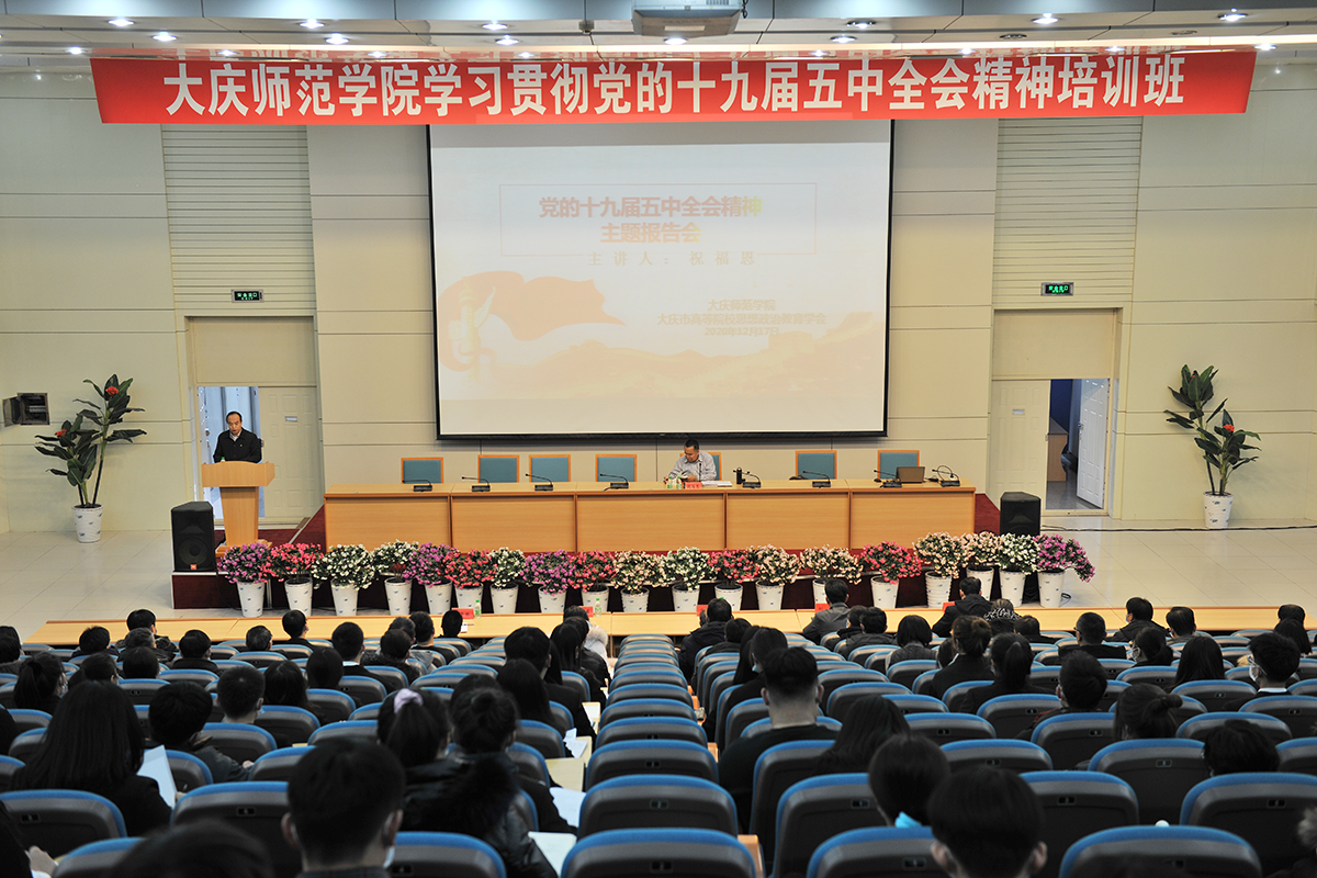 学习好、宣传好、贯彻好党的十九届五中全会精神,是当前和今后一个时期全党的首要政治任务。2020年12月17日下午,学校党委举办学习贯彻党的十九届五中全会精神培训班开班式暨第一场专题辅导。邀请了哈尔滨工程大学马克思主义学院教授、博士生导师祝福恩教授做《党的十九届五中全会及〈建议〉意义背景、当代价值》专题辅导讲座,全面解读党的十九届五中全会精神。学校领导班子成员、科级以上干部、“青马工程”大学生骨干参加了培训。开班式由党委副书记王革主持。