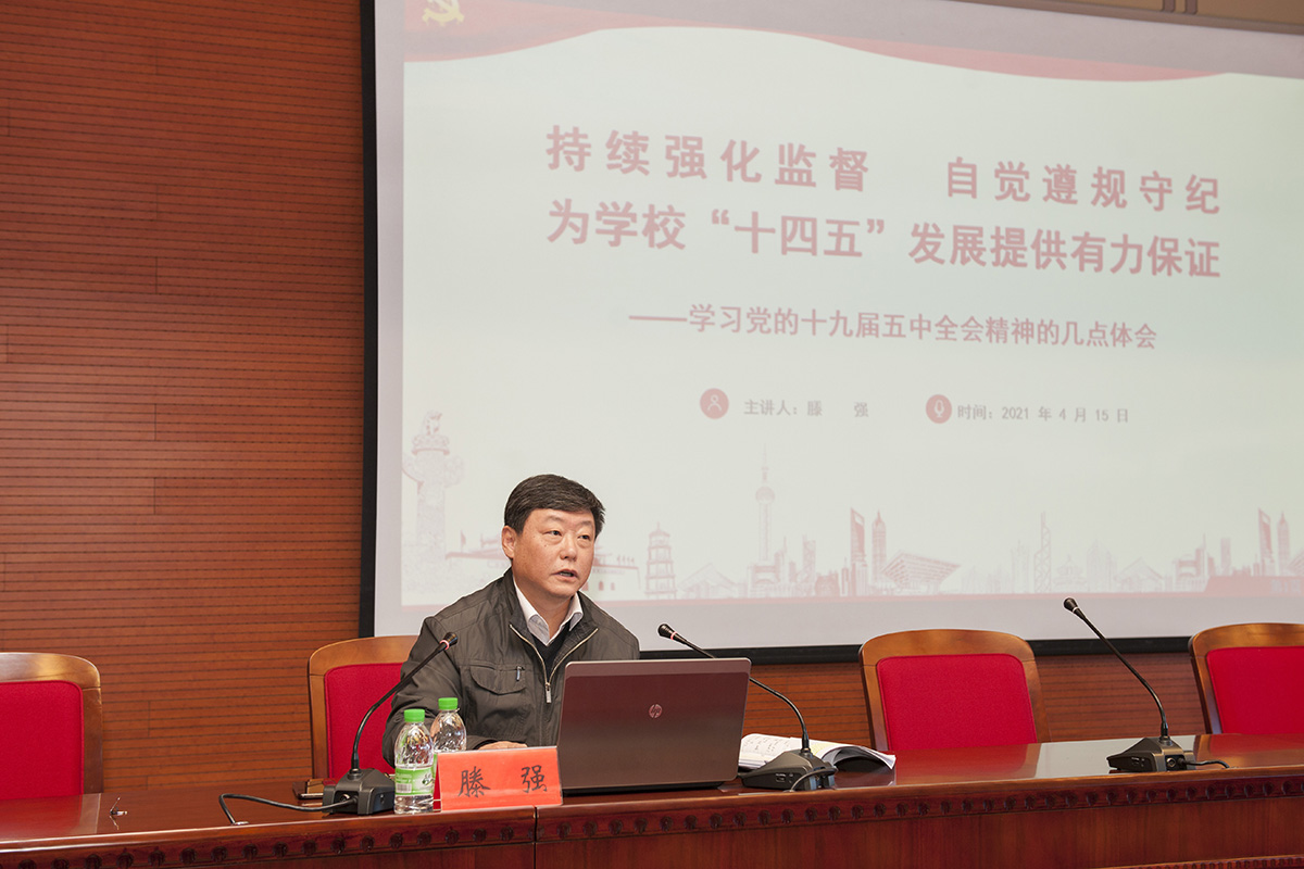 纪委书记滕强以《持续强化监督 自觉遵规守纪,为学校“十四五”发展提供有力保障》为题授课,滕书记从“三新一高”把握十九届五中全会精神的主旨;围绕“监督保障执行,促进完善发展”充分发挥纪检监察机关的职能作用;强化自我约束,在学校“十四五”发展中更好担当作为等三个方面进行讲解。同时,督促引导广大干部公正用权、依法用权、廉洁用权,各级党组织要提高自身建设水平,增强全体干部的党性修养。用为民的服务理念,务实的工作作风,清廉的干部形象,团结和带领全校教职员工,坚定信念、开拓进取,切实把各项工作抓得更实、做得更好,为落实“十四五”规划营造良好政治生态和发展环境。