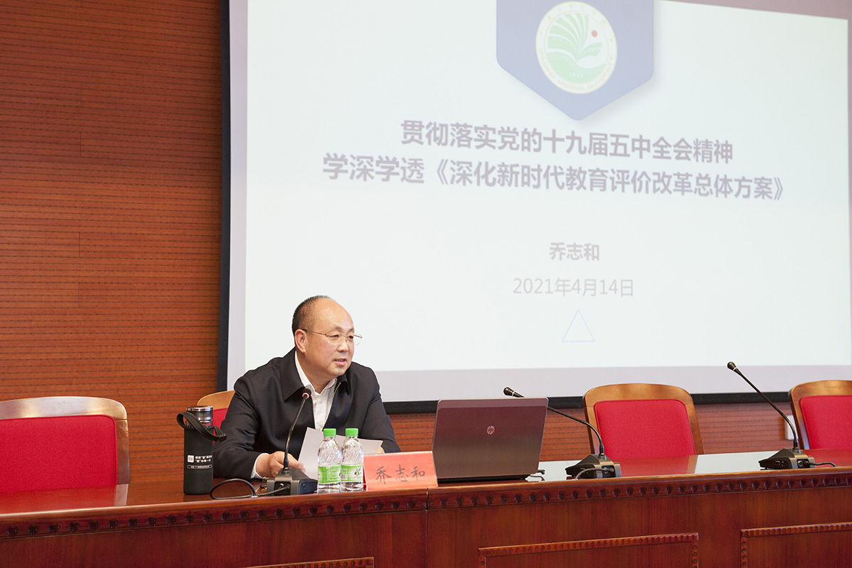 校长乔志和以《贯彻落实党的十九届五中全会精神 学懂学透〈深化新时代教育评价改革总体方案〉》为题授课,乔校长站在推动“十四五”高等教育高质量发展大背景下,深刻阐述了《总体方案》出台的背景和意义、基本定位和特点、主要内容和高质量落实四个方面进行了全面、深入和透彻的解读。报告既有宏观层面对形势政策的分析,列举了当前国家教育事业发展亟需应对和解决的迫切问题,传达了《总体方案》对党委和政府、学校、教师、学生和社会五类主体应当承担职责的界定和要求,又有立足学校实际的对如何落实《总体方案》进行了系统思考和整体部署,为我们深入贯彻落实党的十九届五中全会精神,为学校“十四五”开好局、起好步明确了指导方针。