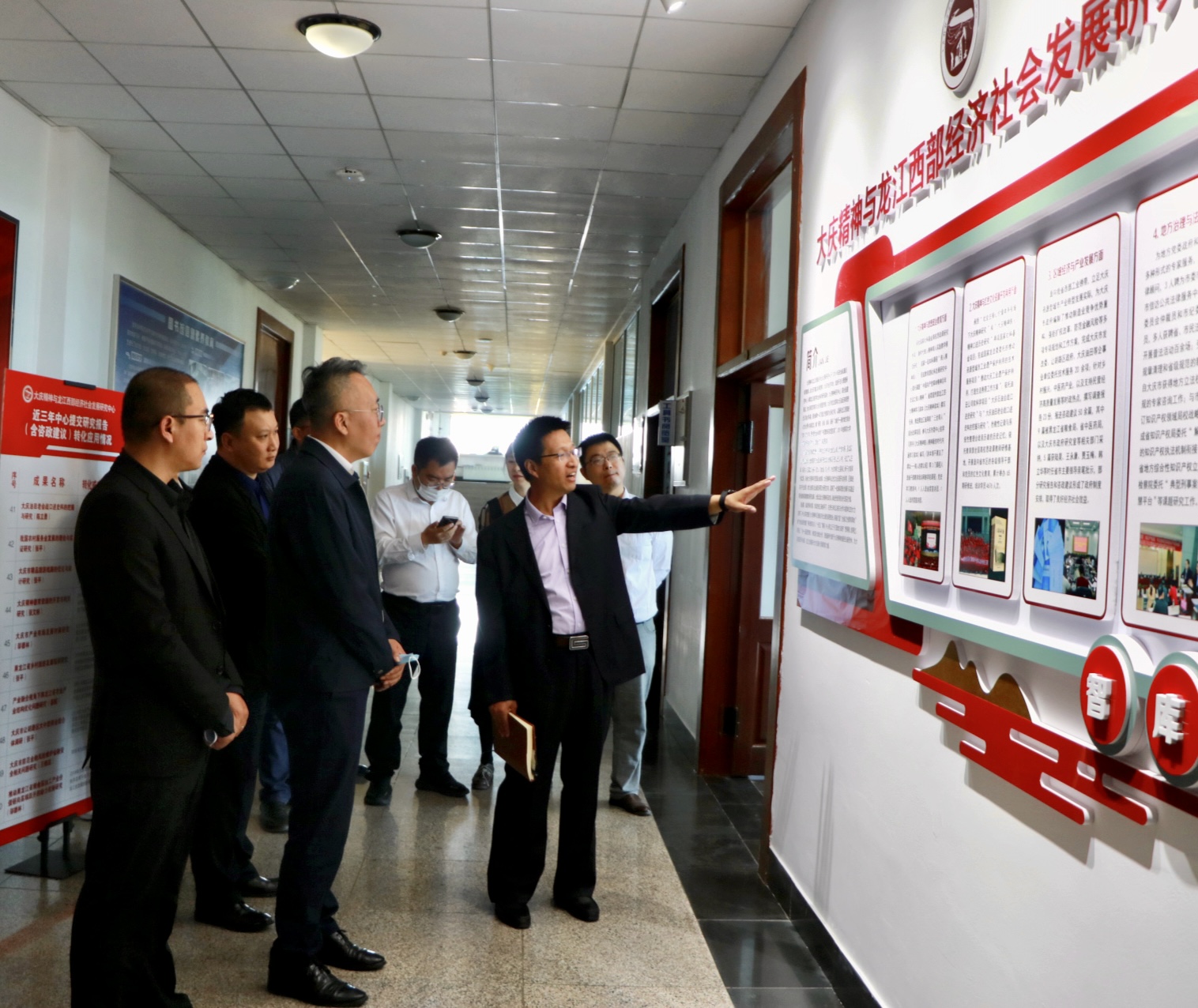 会前,张平副校长邀请闫午斌会长一行到图书馆四楼大庆精神文献研究中心和大庆精神与龙江西部经济社会发展研究中心省级培育智库进行了参观,张平副校长和陈立勇副教授分别进行了讲解。