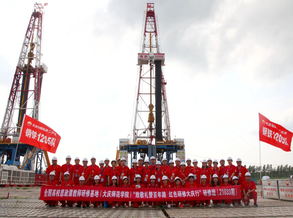 在钢铁1205钻井队页岩油开发古龙井场,学员们实地踏访钢铁1205队,近距离感受铁人队伍的风采,将研修活动推向最高潮。在广袤的原野上,钢铁1205钻井队70米钻机巍巍耸立,钢铁1205钻井队队旗迎风飘扬,蔚为壮观,十分震撼。大家聆听了05队党支部书记段永坚同志的队史讲解,齐唱《踏着铁人脚步走》,穿越大庆油田60余年开发史,见证历史与现实,由衷歌颂以铁人为代表的石油工人的坚强与豪迈,珍惜大庆创业史,勇做翻天覆地人。